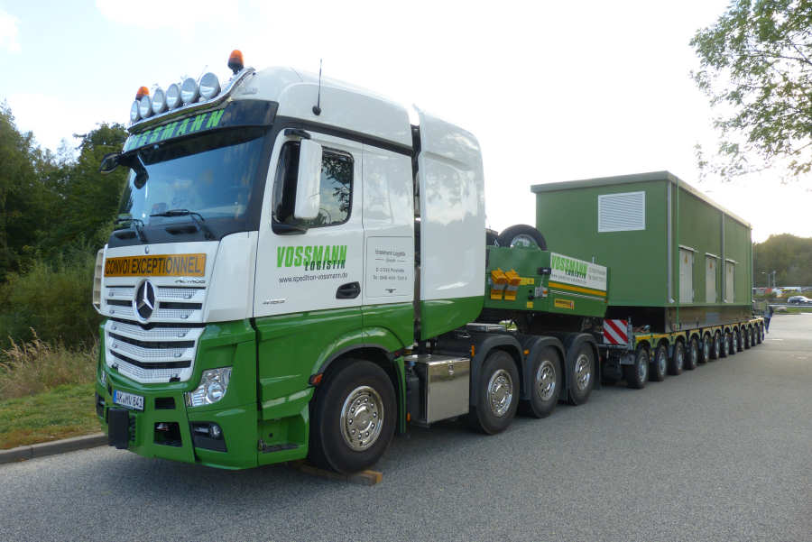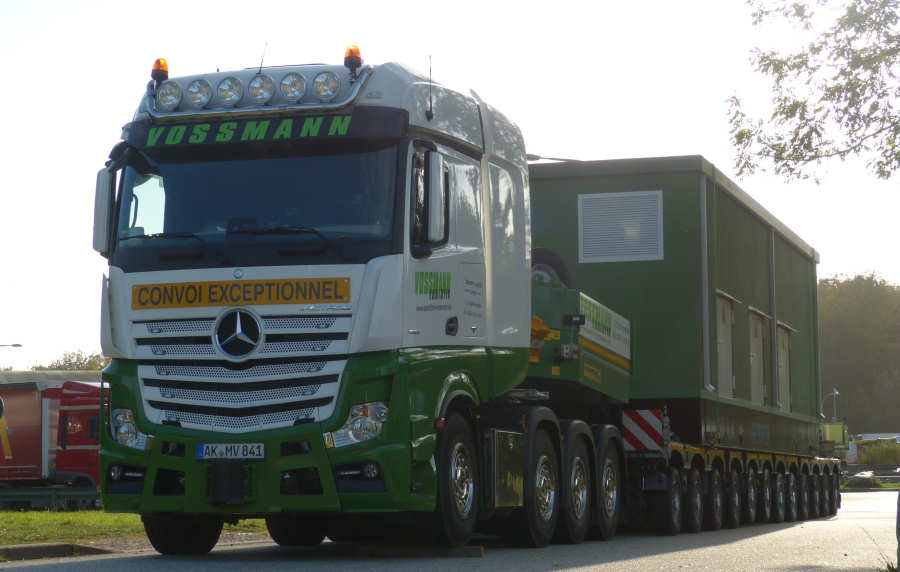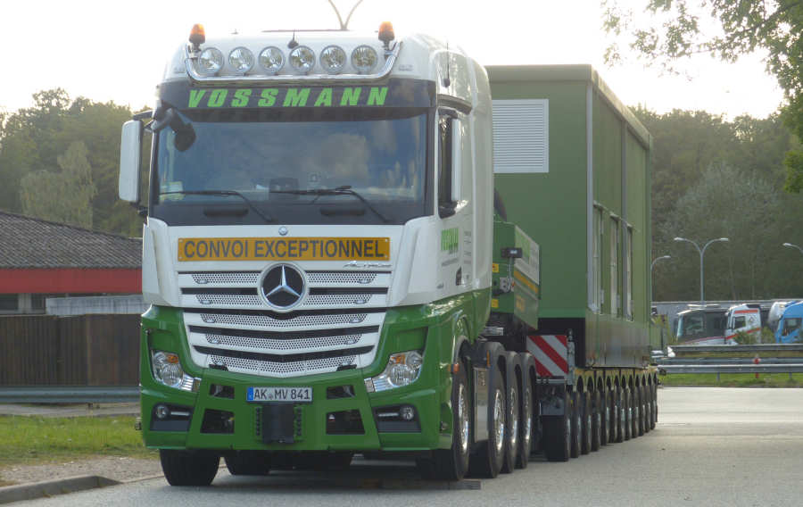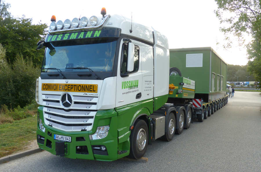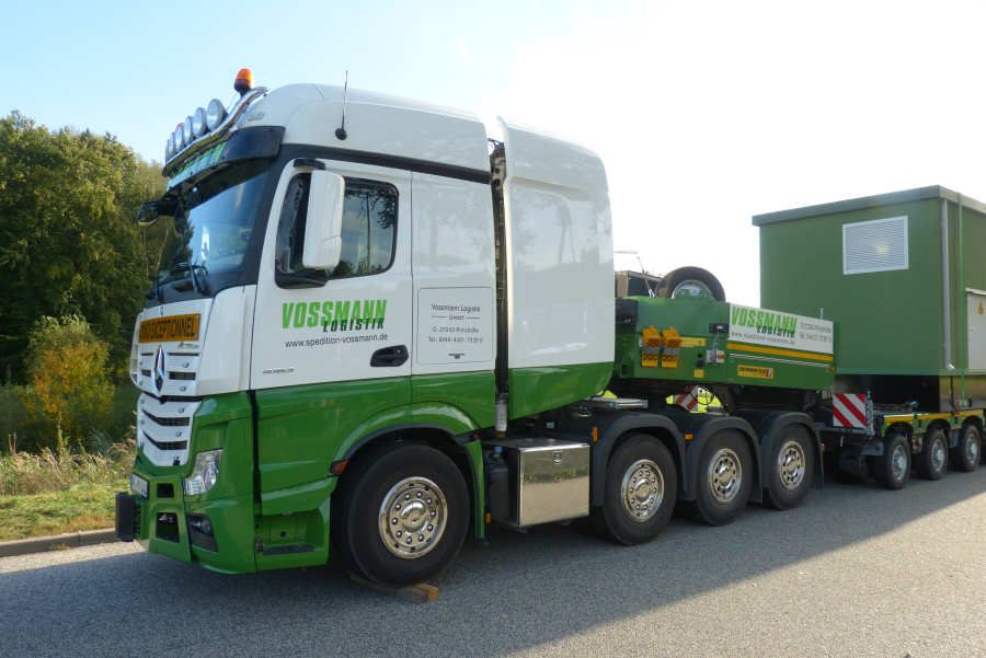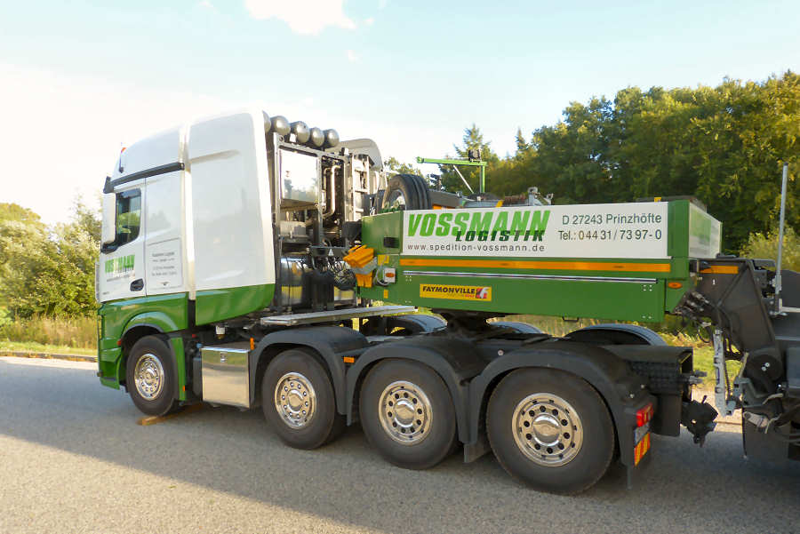 Eine der beiden 2016 in Dienst gestellten MB 4163 Actros SLT von Vossmann Logistik mit einem Faymonville 12 achs Sattelroller