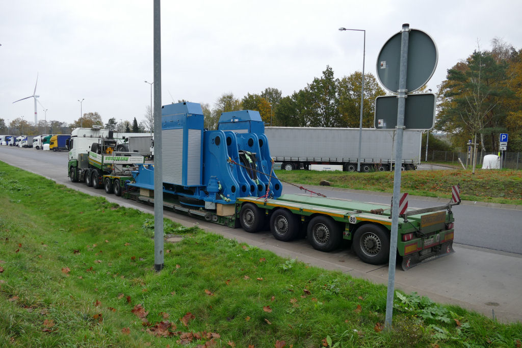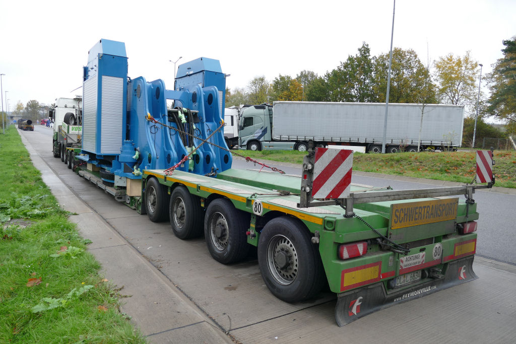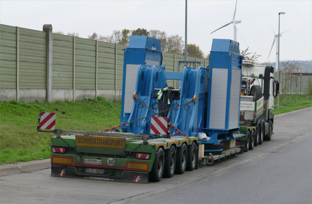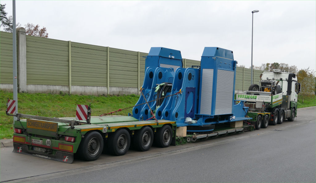 MB 2858 Actros MP 4 mit Faymonville Variomax 2/4 Tieflader und Bauteil eines Sennebogen 895 E