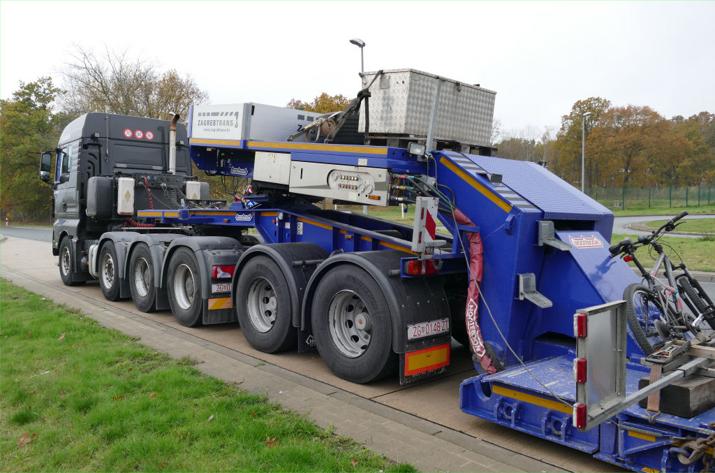 Die Schwerlastkombination bestand aus MAN 41.540 TGX 8x4 mit Nooteboom 2-4 Euro Jeepdolly Tieflader.