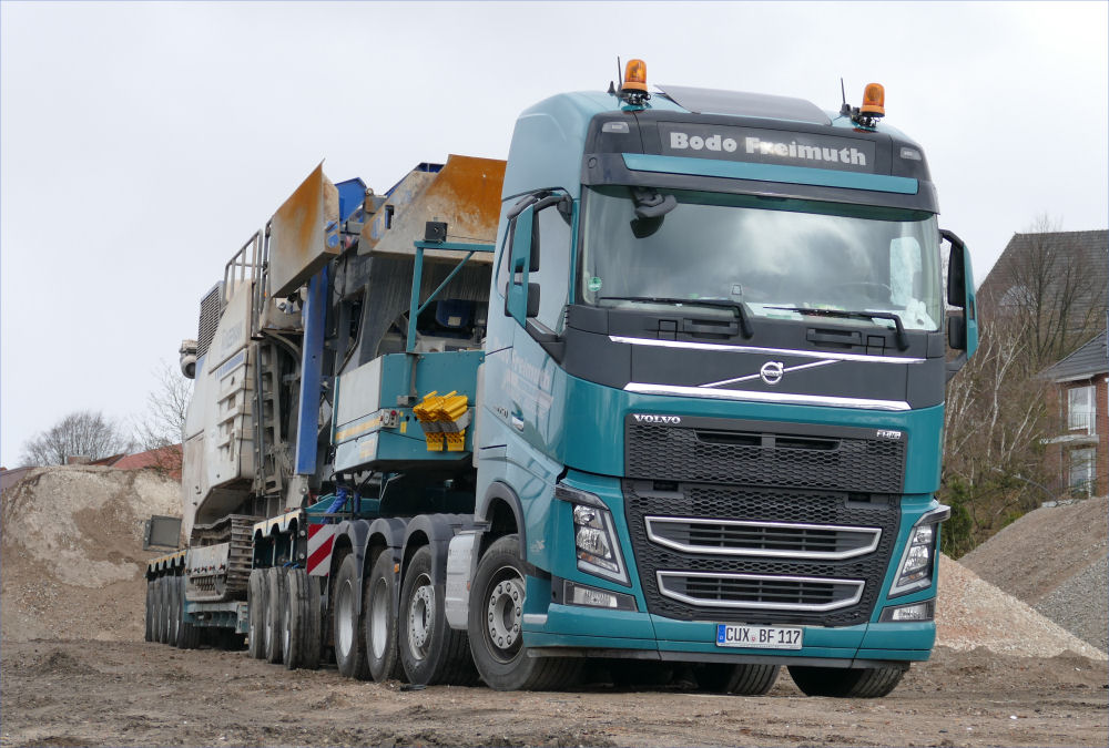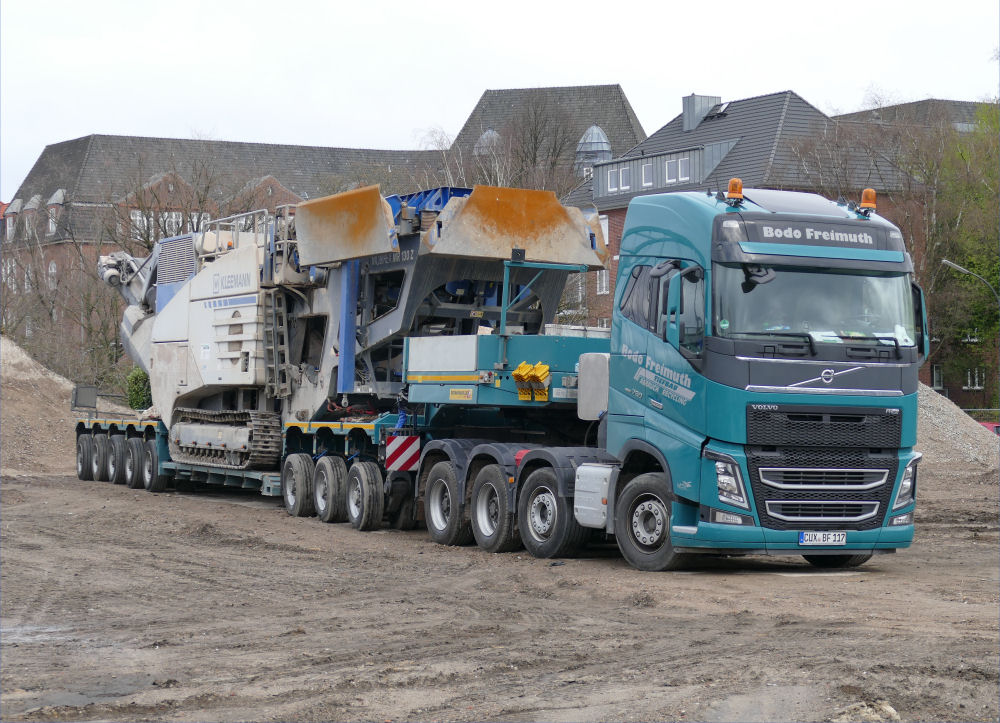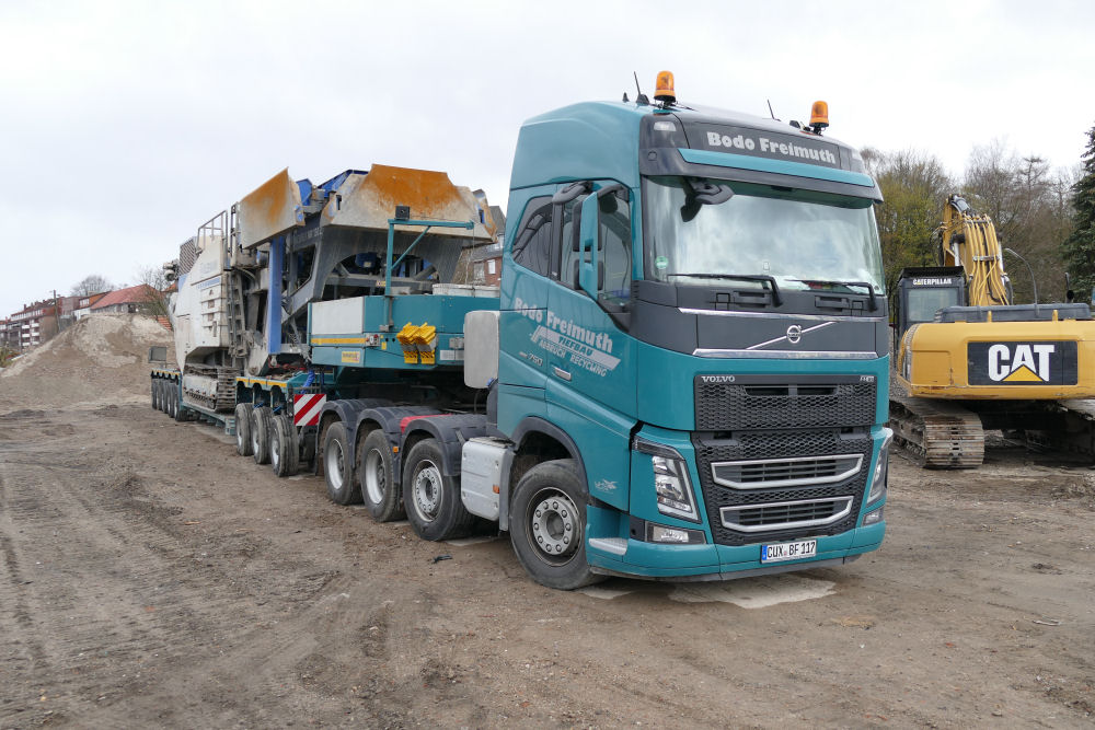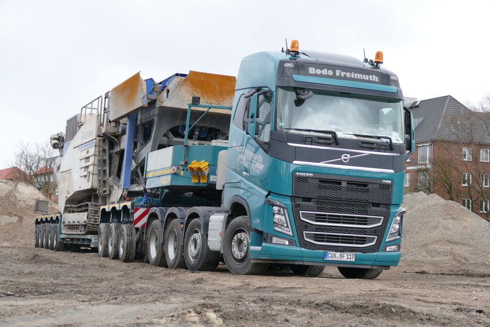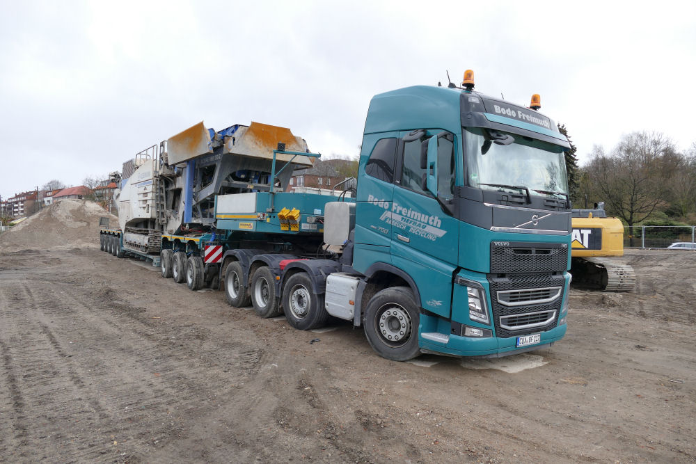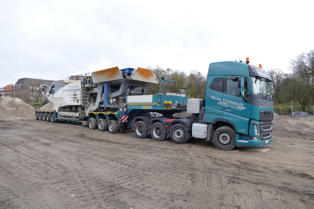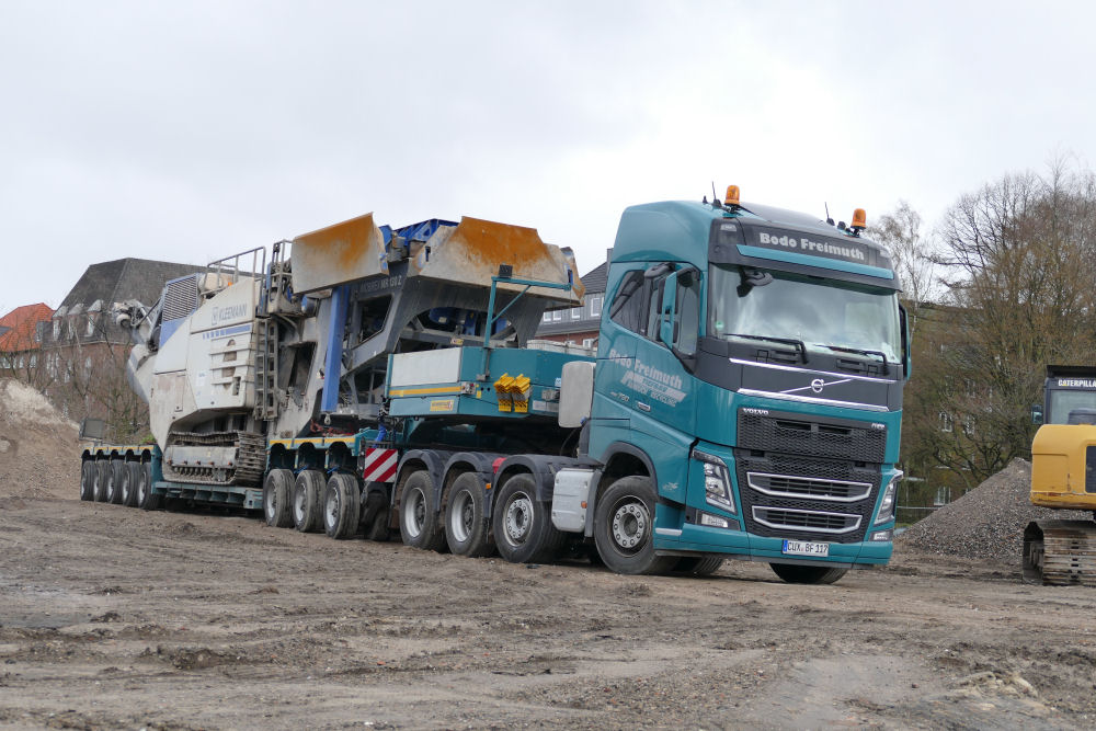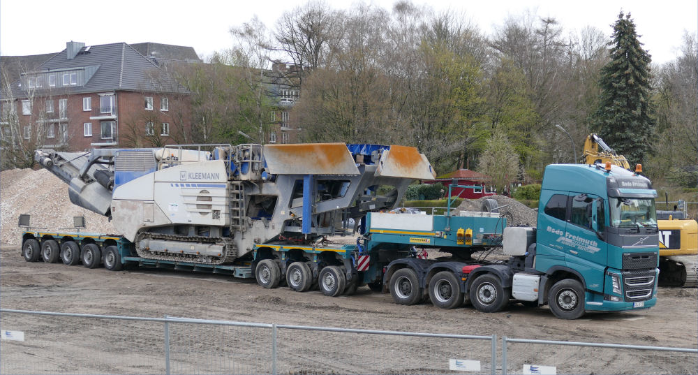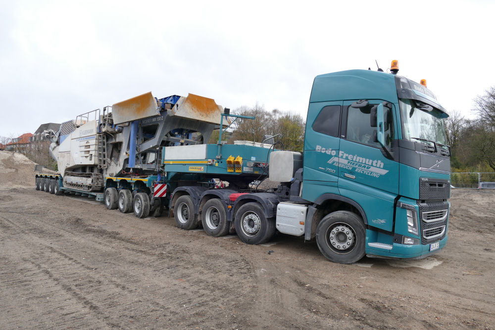 Volvo FH 04 750 mit Faymonville 3-5 Variomax Tieflader und Kleemann Mobirex MR 130 Z Brechertransport