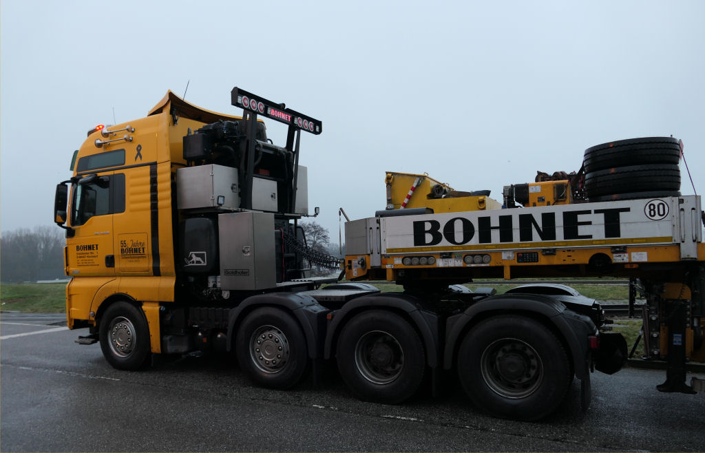 Die Transportkombination bestand aus MAN 41.640 TGX und Goldhofer achtachs Semitieflader
