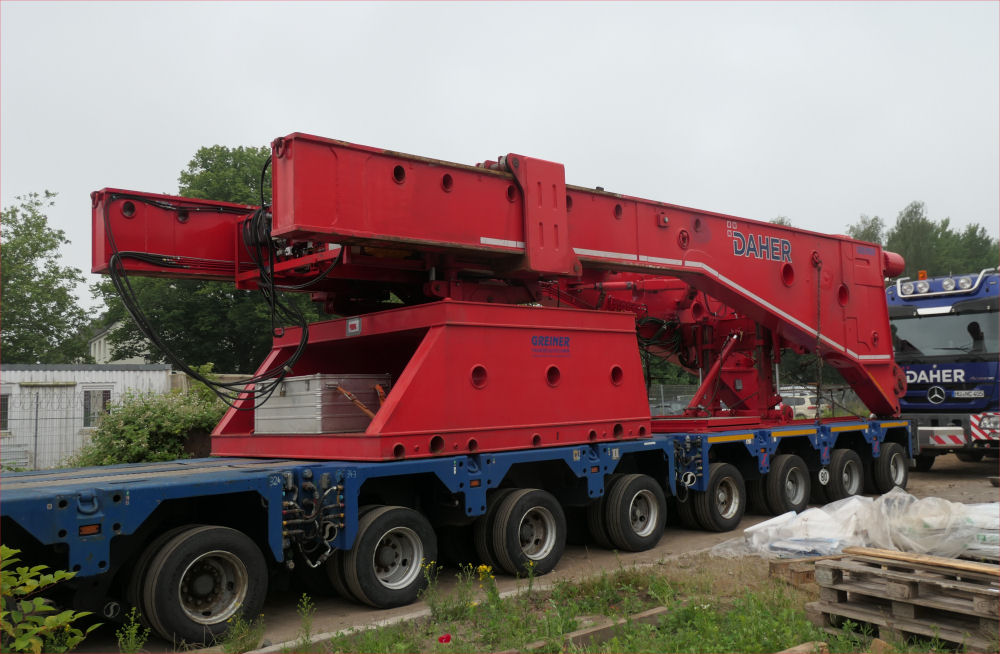 Für den Strassentransport setzte Daher eine Greiner Tragschnabel Kombination auf 2 x 11 Scheuerle Intecombi,
