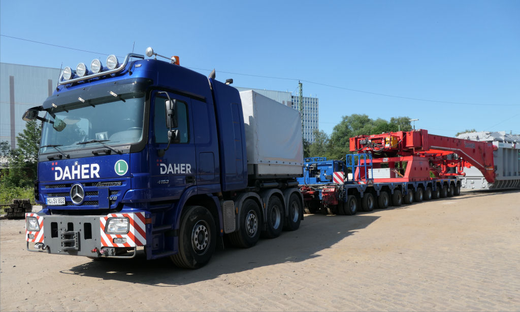 Für den Strassentransport setzte Daher eine Greiner Tragschnabel Kombination auf 2 x 11 Scheuerle Intecombi,