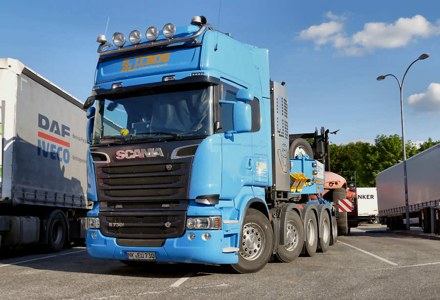 R 730 8x4 und Faymonville 2/4 Tieflader ein.