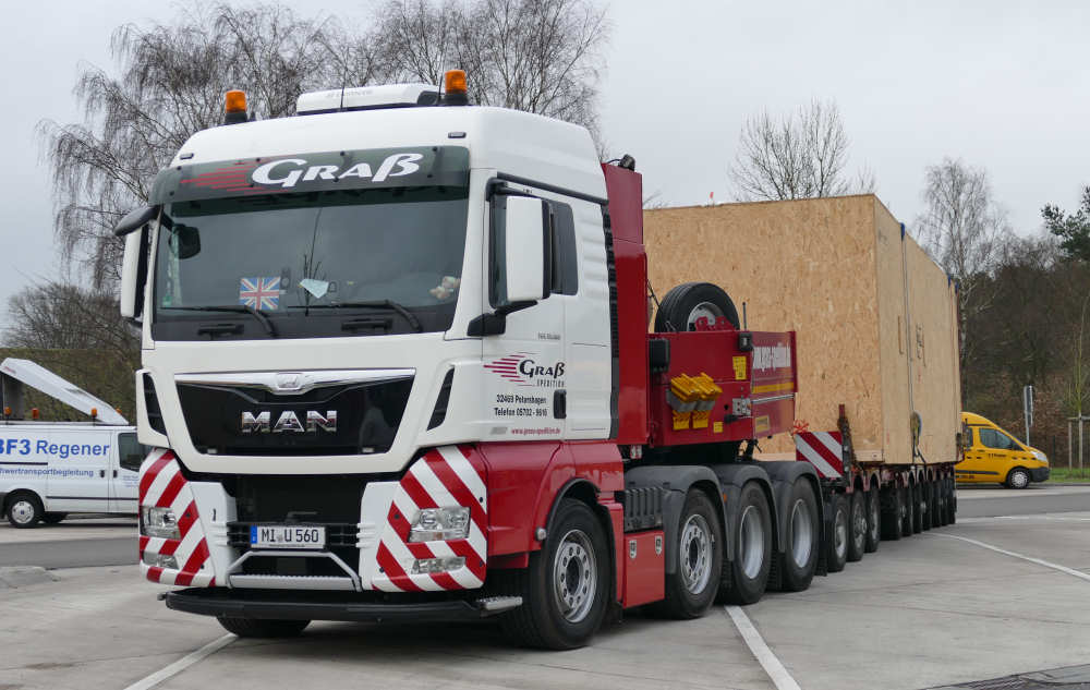 Es wurden rund 65 t schwere Maschinenkisten für den Export transportiert.