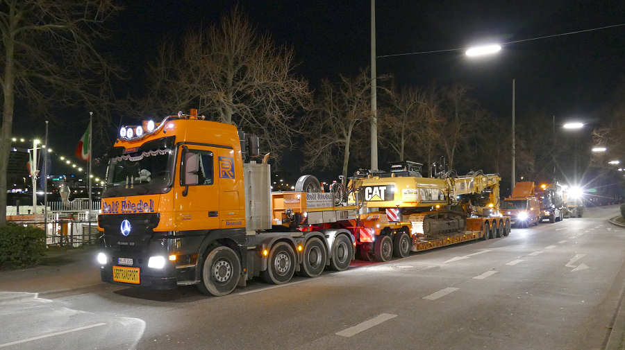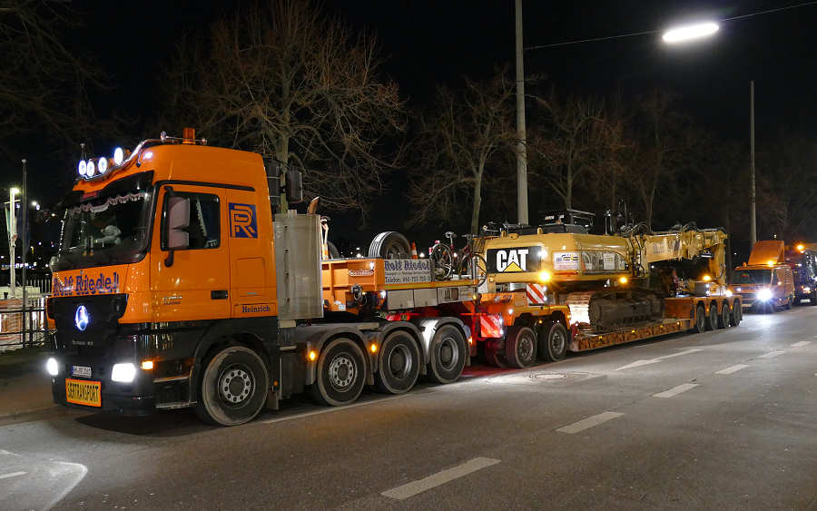 Zum Transport kam die MB 4160 MP 3 Titan mit Nooteboom 2/4 Tieflader von Rolf Riedel zum Einsatz.