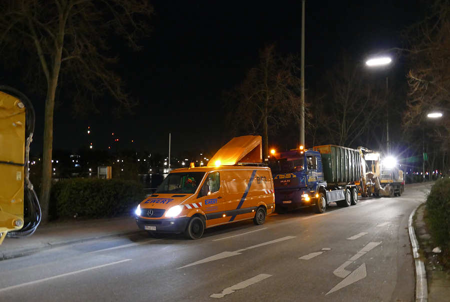 Der Transport stand zunächst, mit weiteren Fahrzeugen von Ehlert, am Ballindamm in Wartestellung, bis die Baustelle zur Ankunft