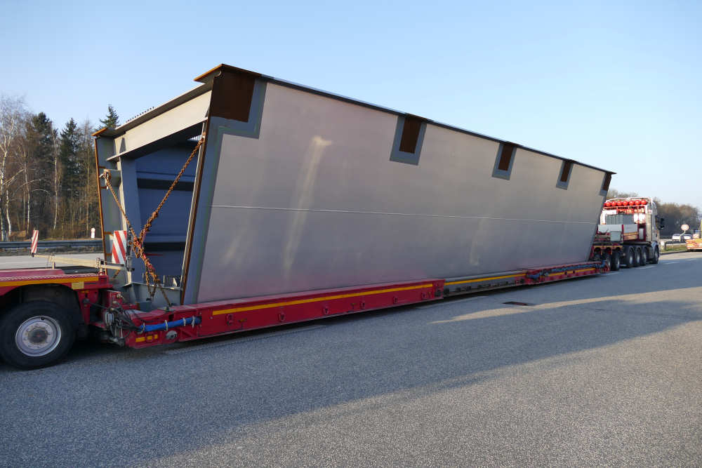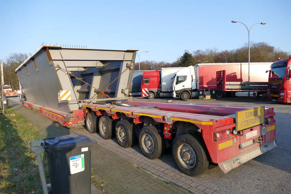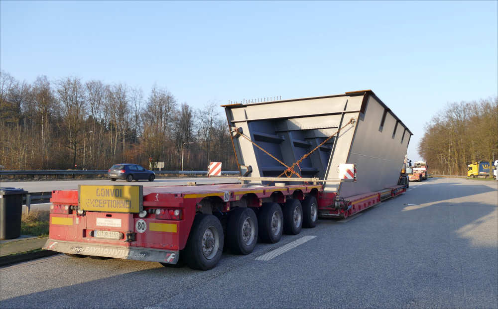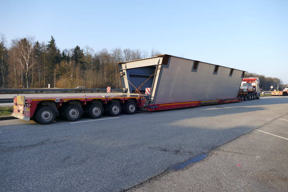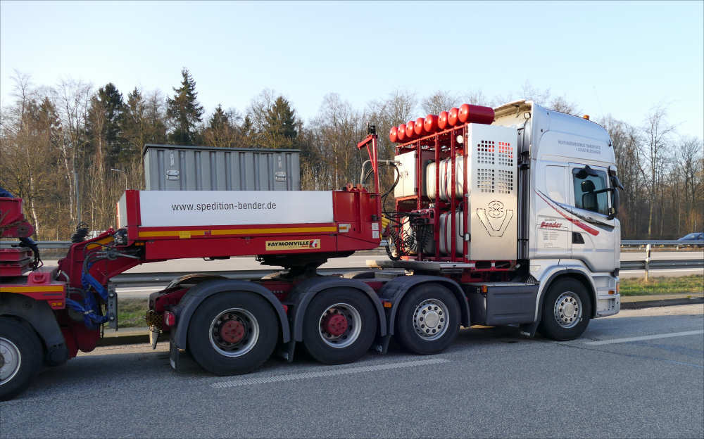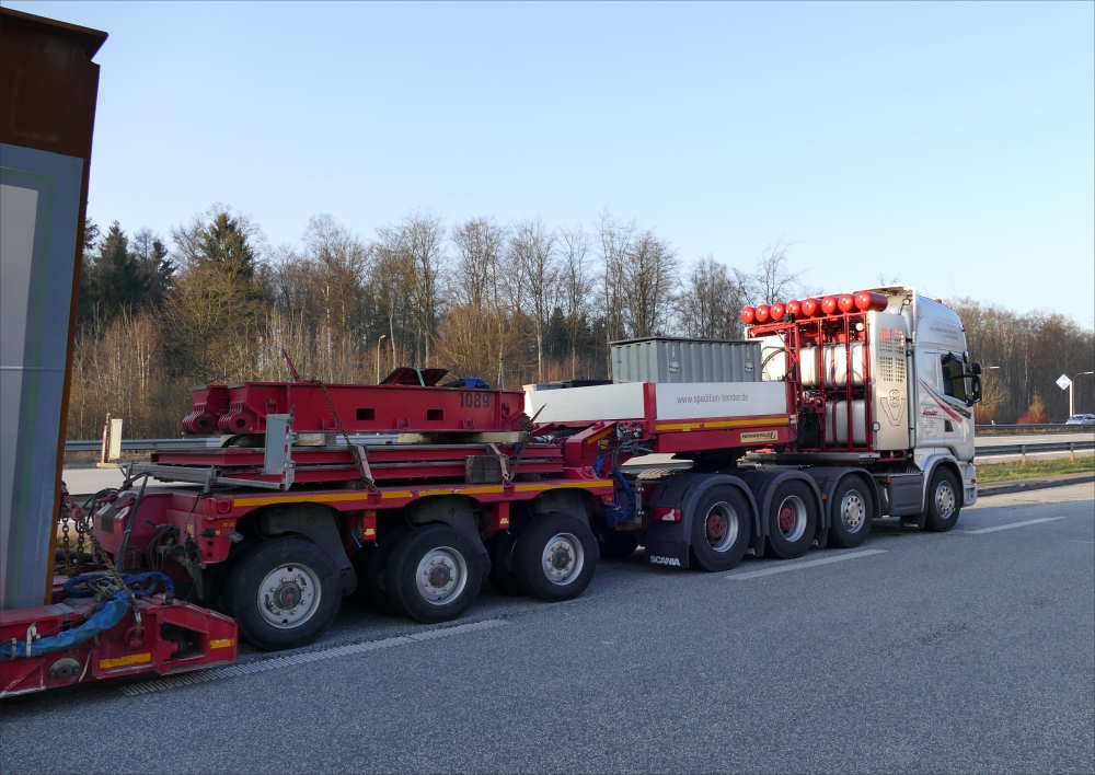 Zweimal Scania R 580 8x4 mit Faymonville 3/5 Tieflader und Brückensektion für die Langenfelder Brücke