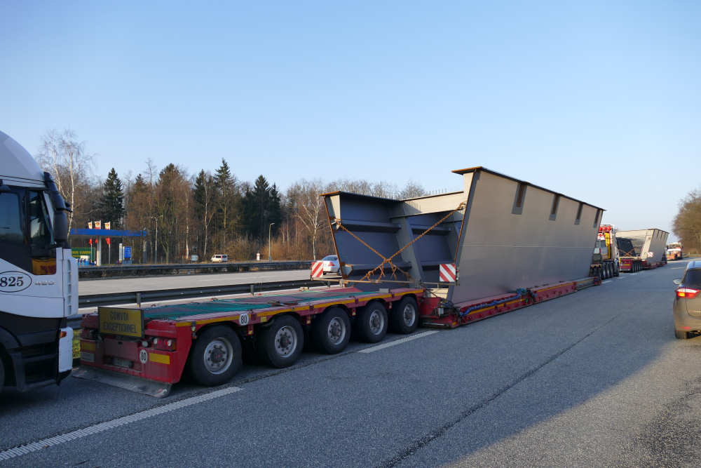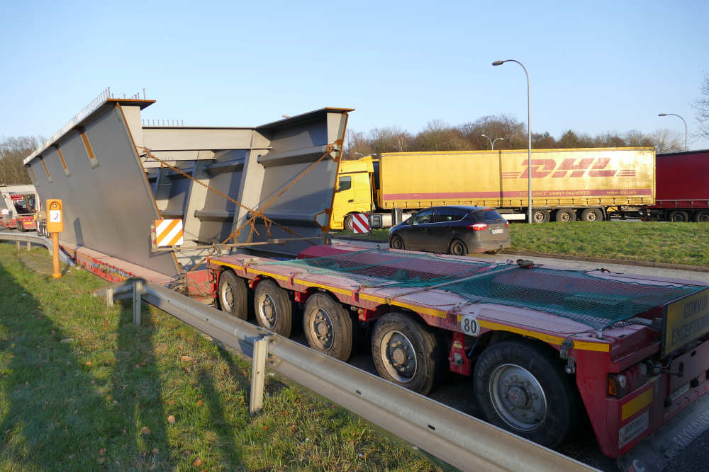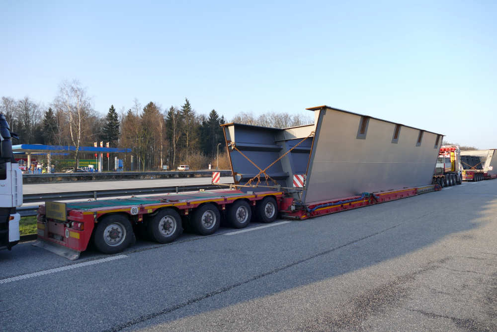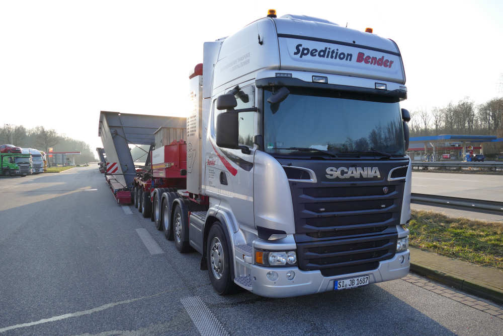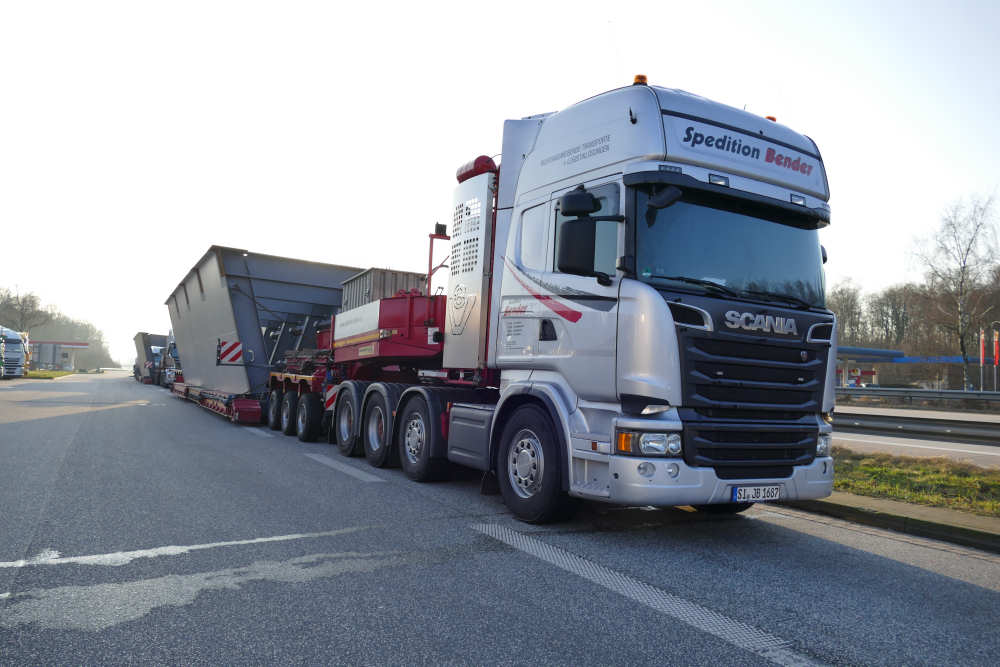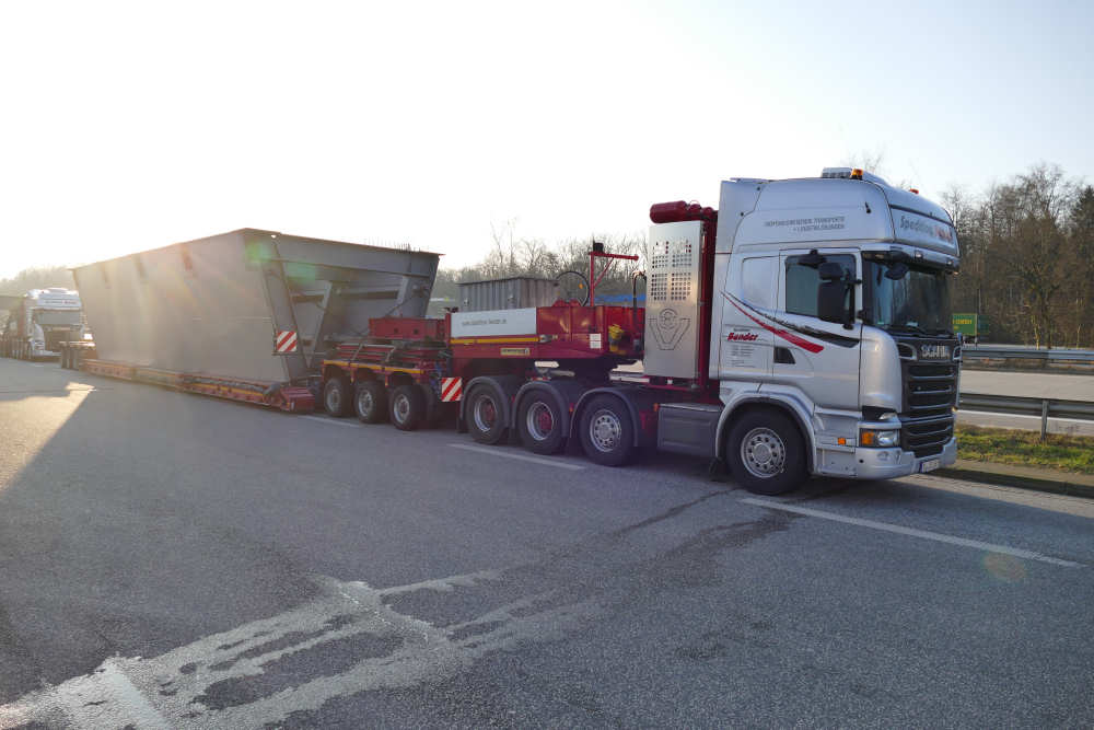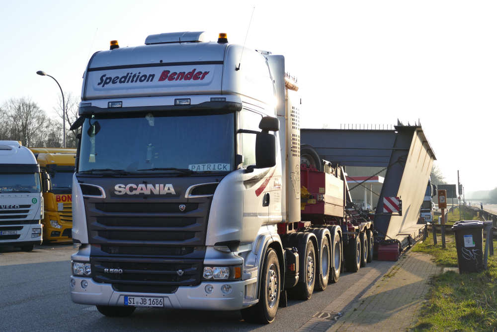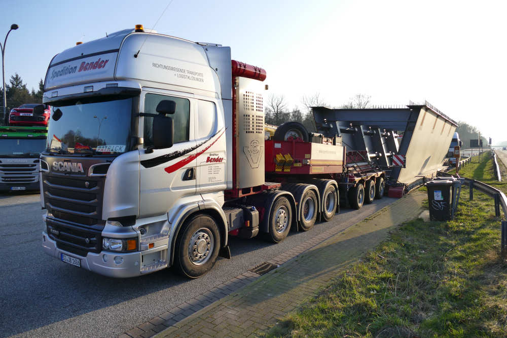 Zweimal Scania R 580 8x4 mit Faymonville 3/5 Tieflader und Brückensektion für die Langenfelder Brücke