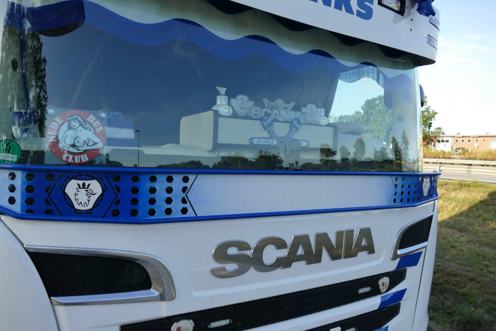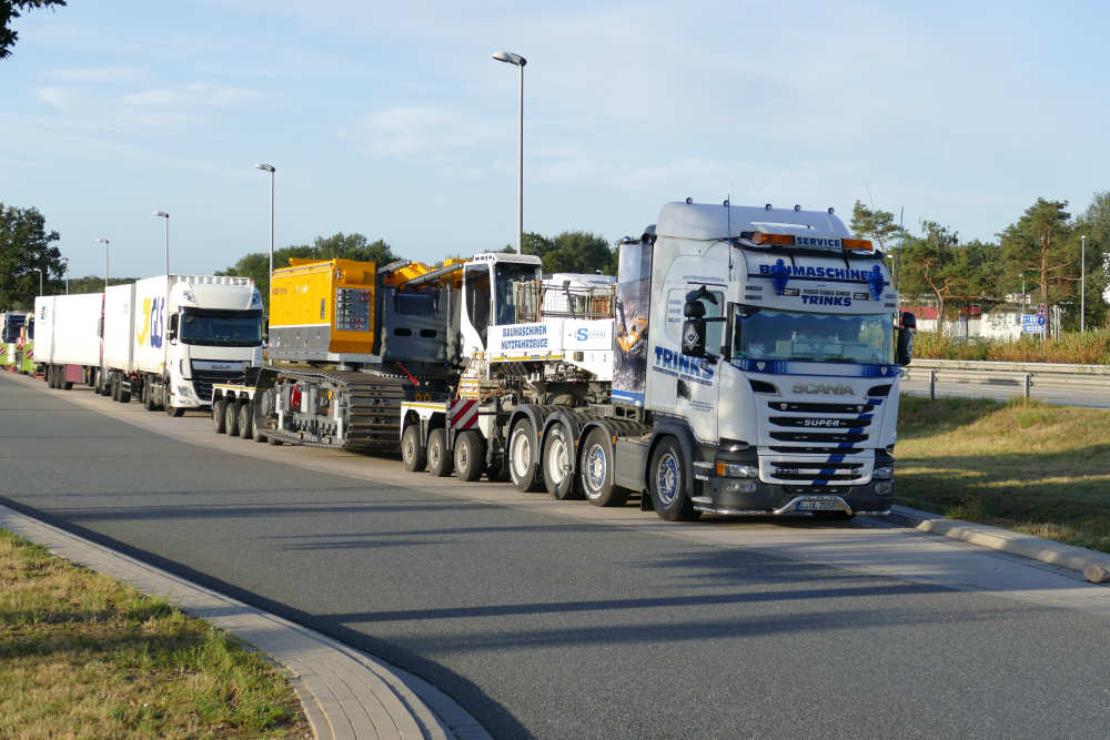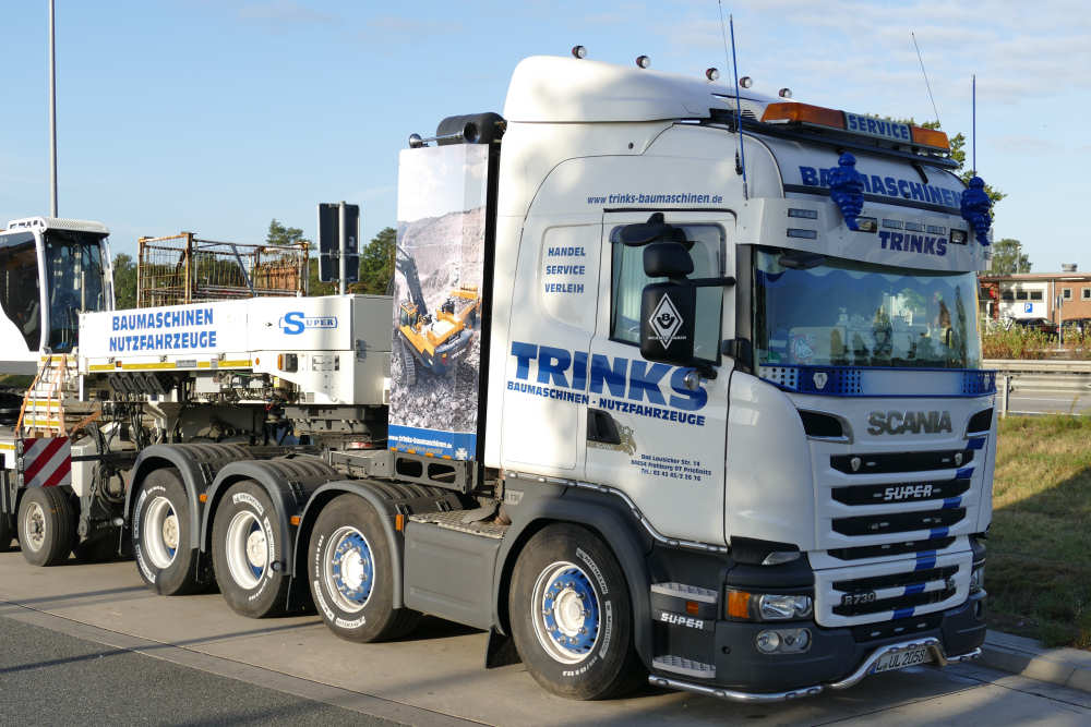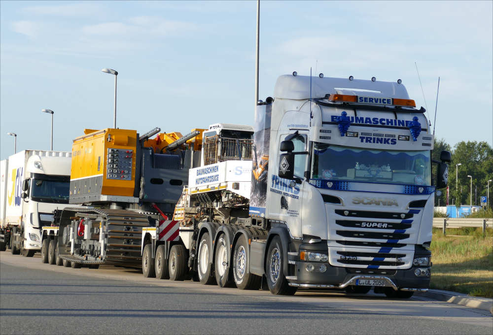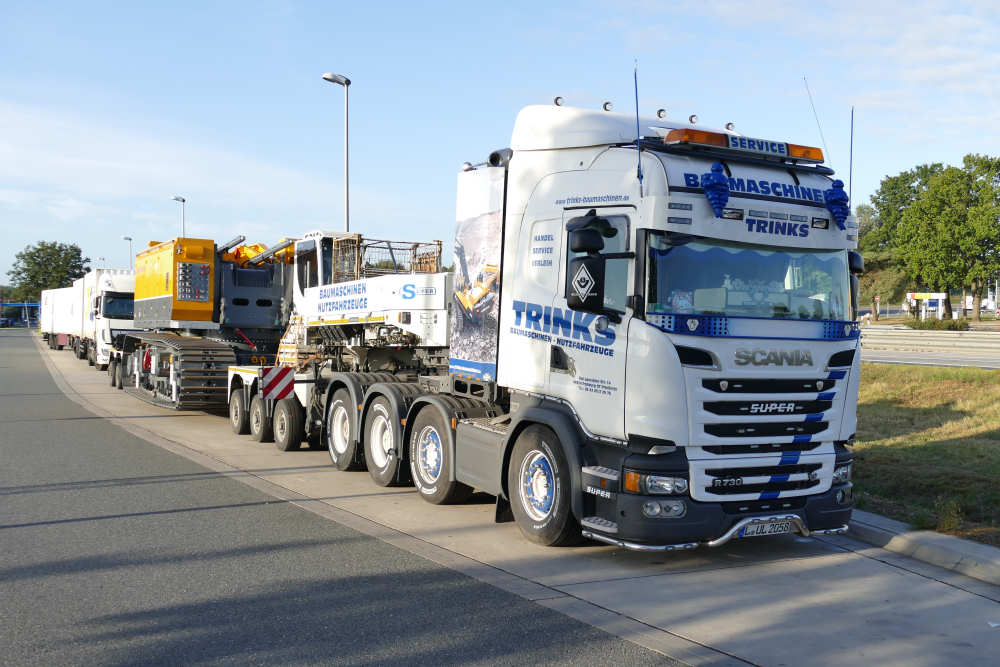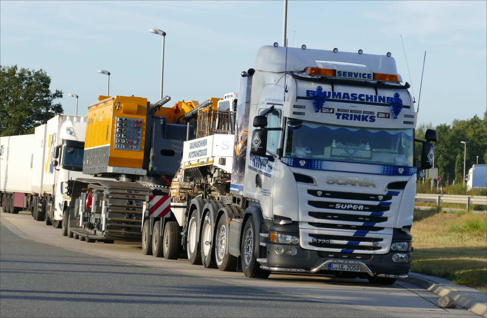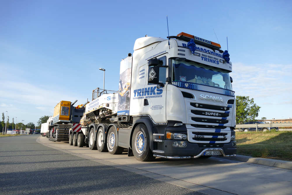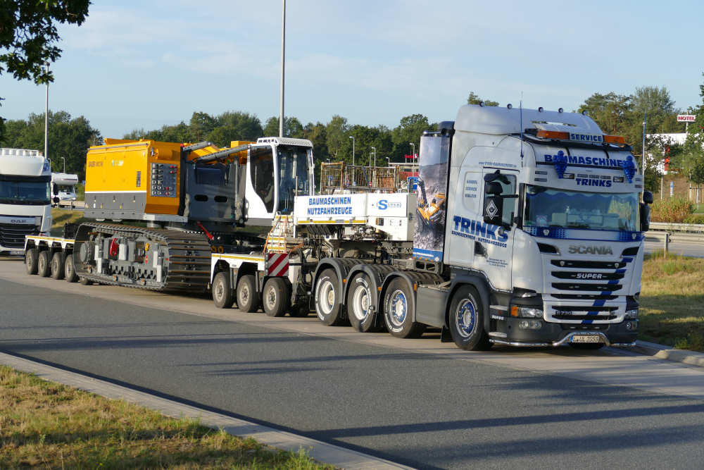 Scania R 730 8x4 mit Goldhofer 3/5 Tieflader und Bauer MC 96 Grundgerät Transport