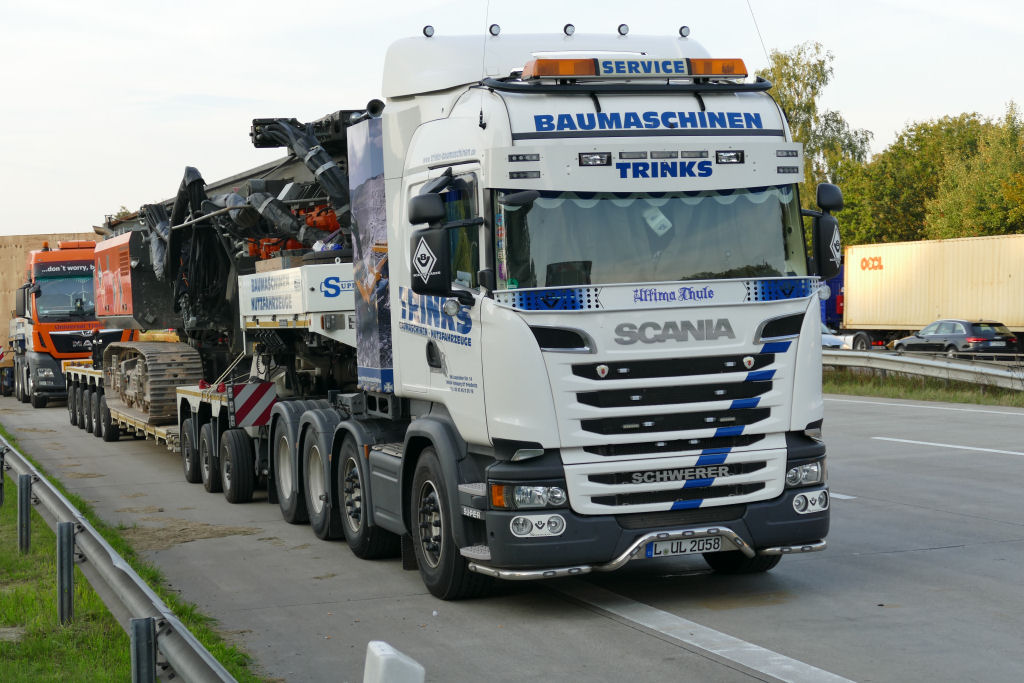 Scania R 730 8x4 mit Goldhofer 3/5 Tieflader und RH 24-270 Drehbohrgerät von BWH
