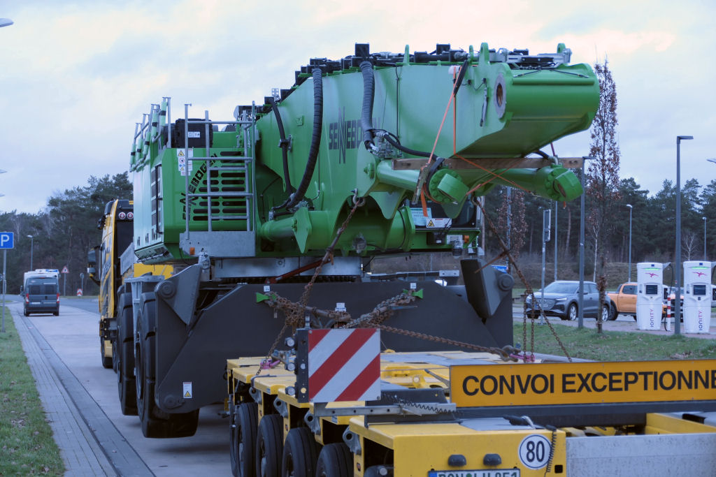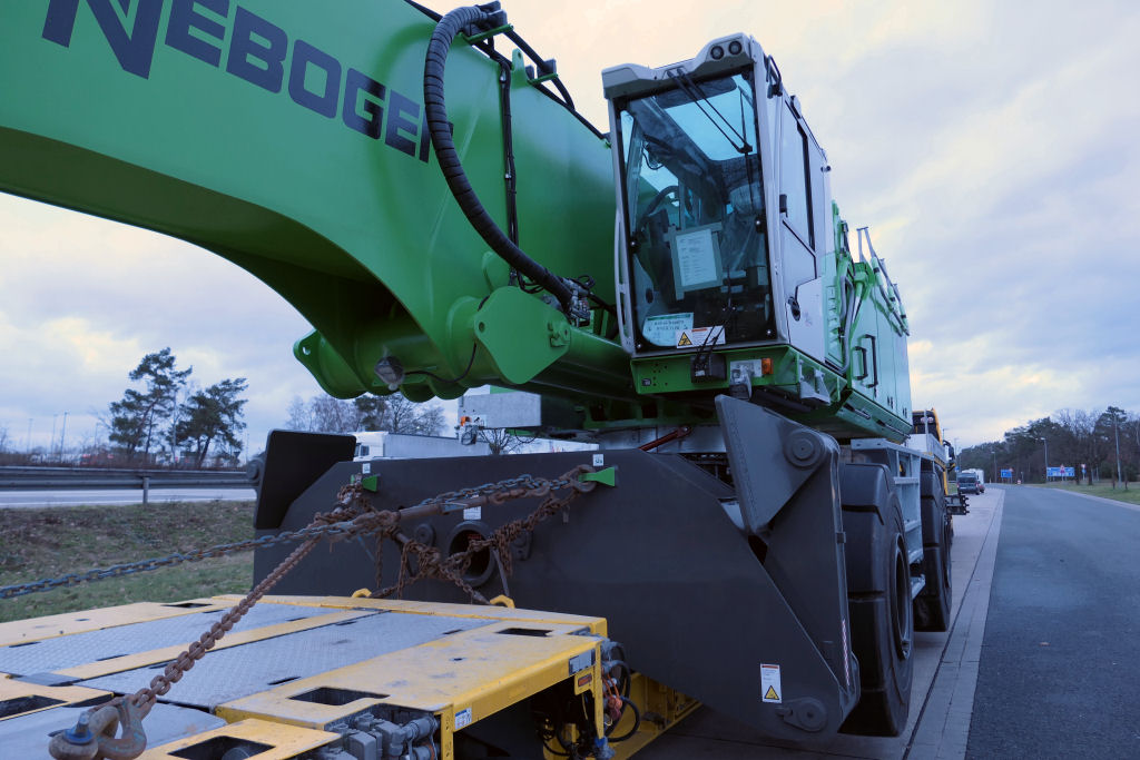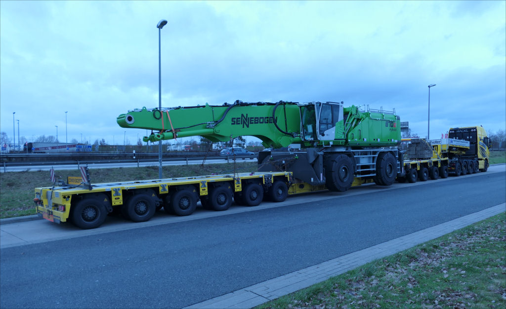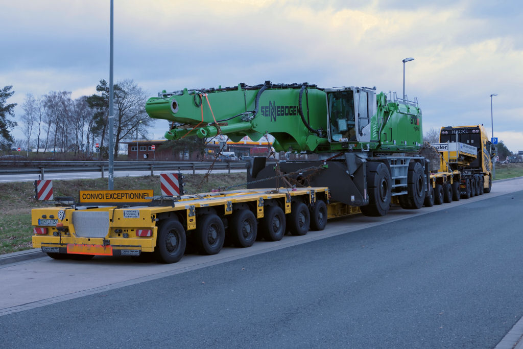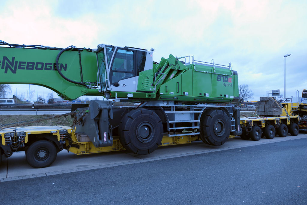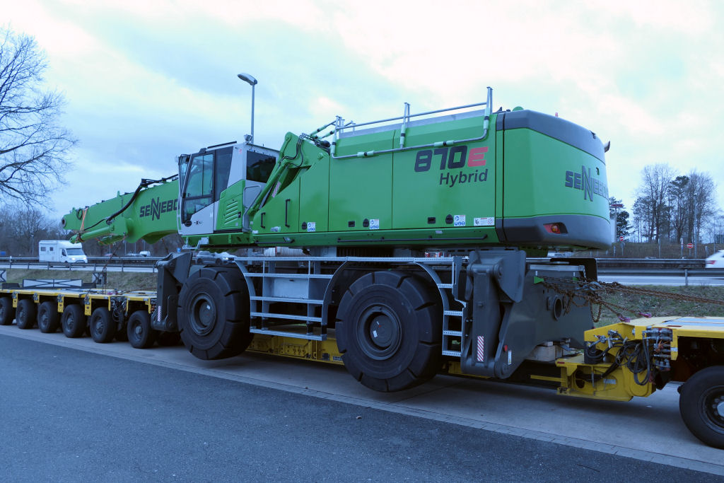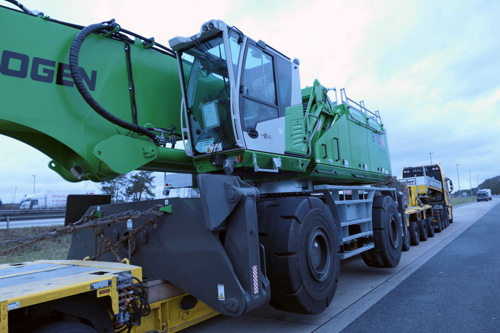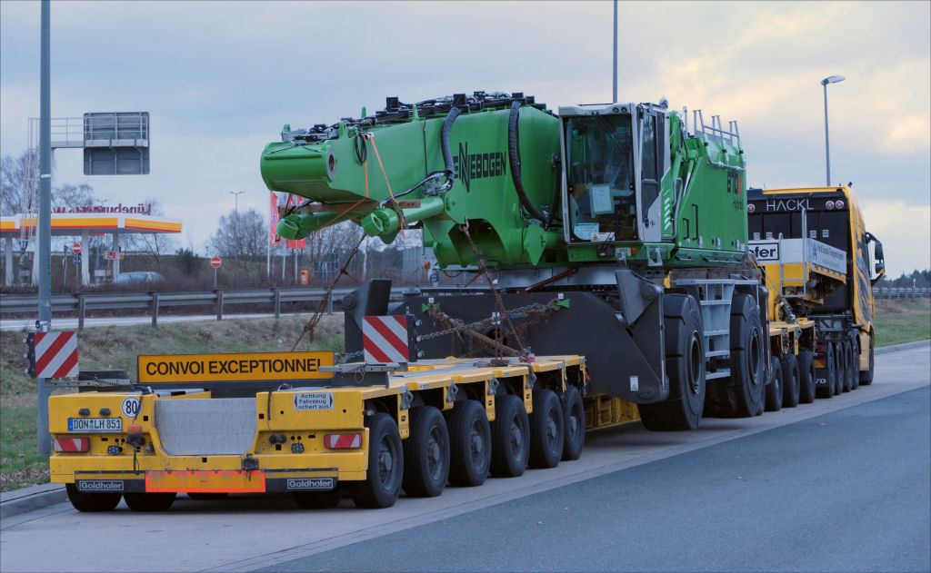 Volvo FH 05 750 10x4 mit Goldhofer THP  4-6 Sattelroller mit Baggerbrücke, beladen mit Sennebogen 870 E