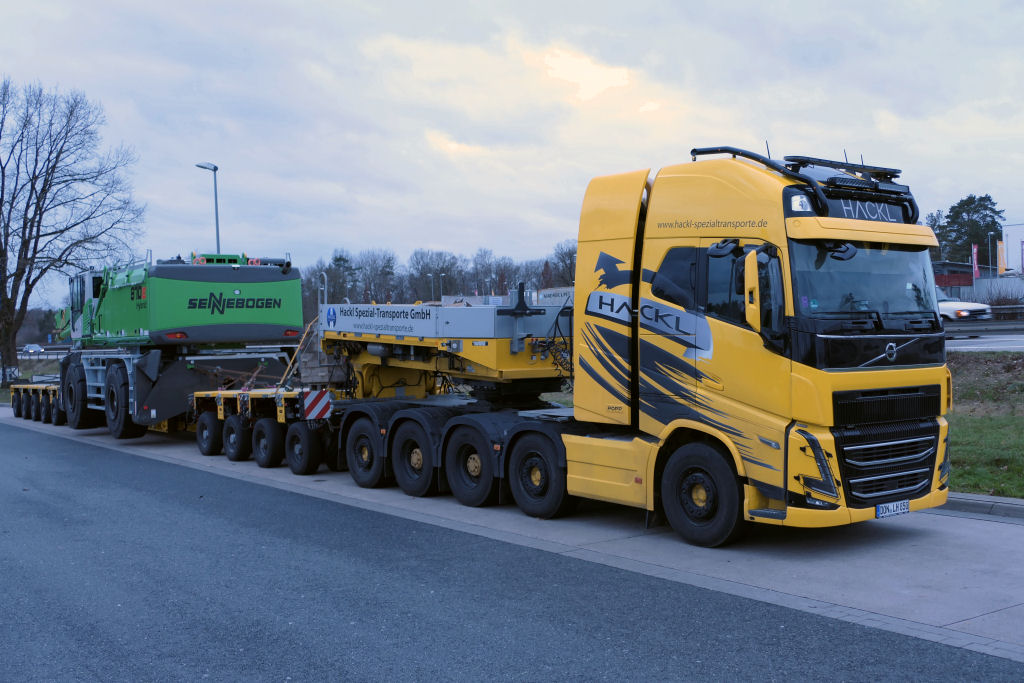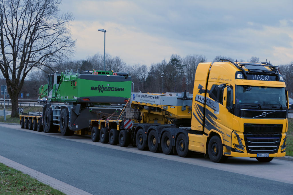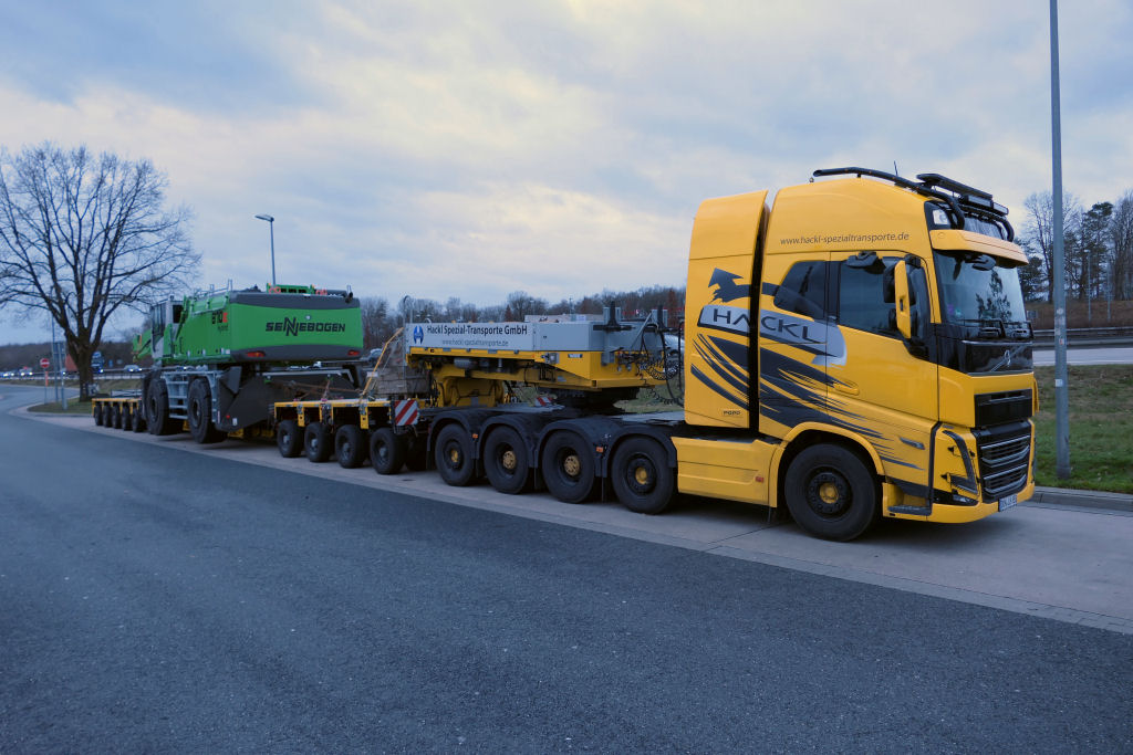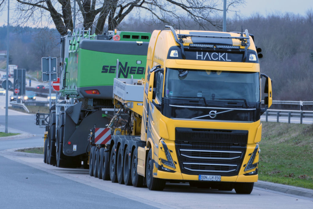 Volvo FH 05 750 10x4 mit Goldhofer THP 4-6 Sattelroller mit Baggerbrücke, beladen mit Sennebogen 870 E