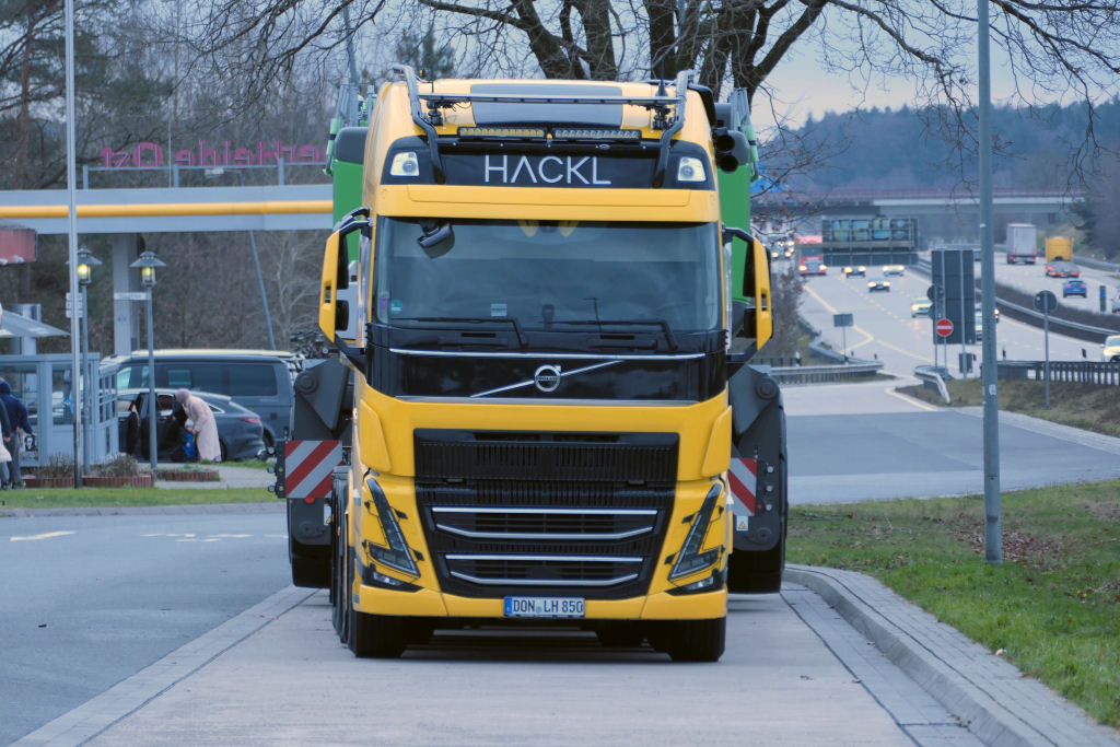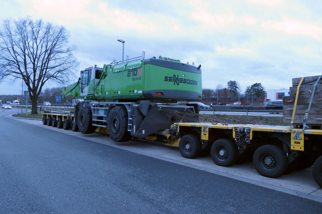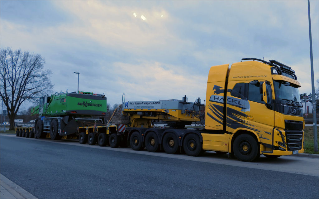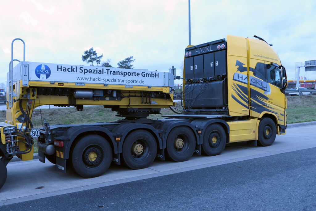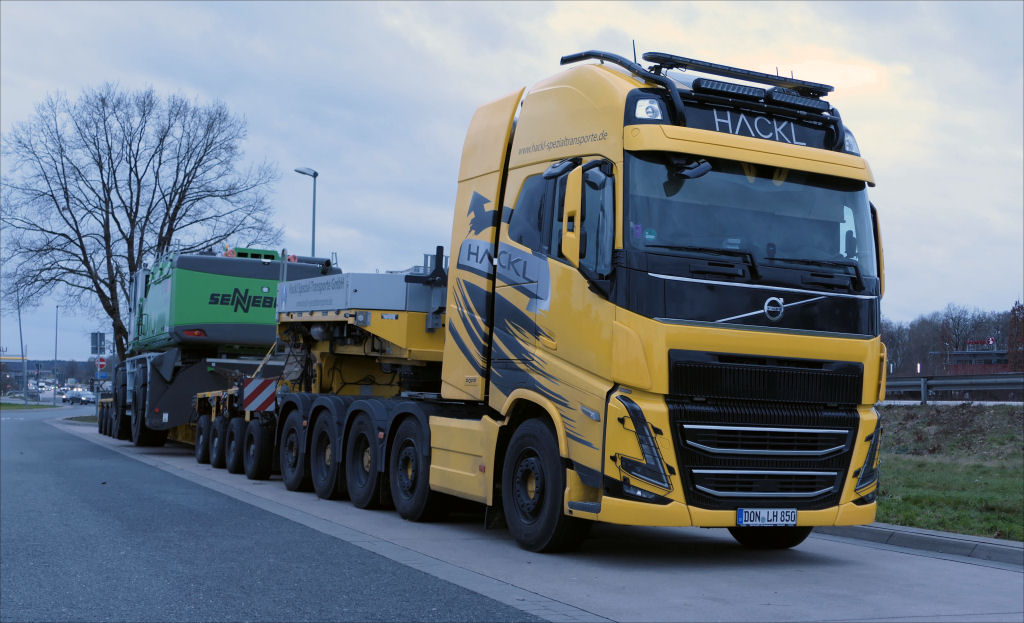 Volvo FH 05 750 10x4 mit Goldhofer THP 4-6 Sattelroller mit Baggerbrücke, beladen mit Sennebogen 870 E