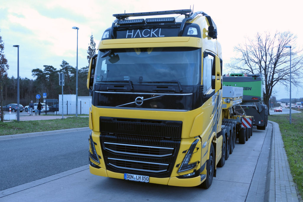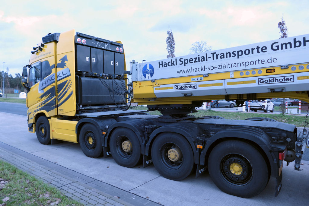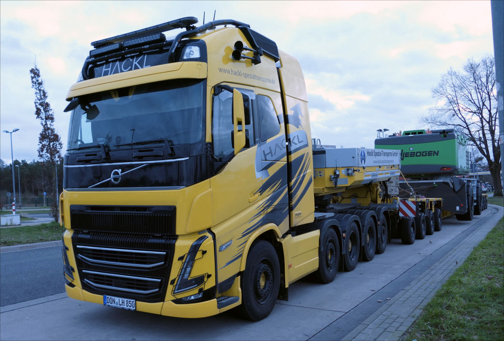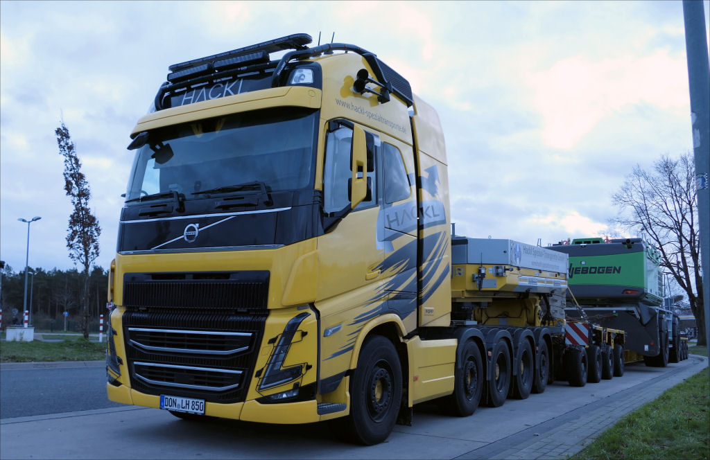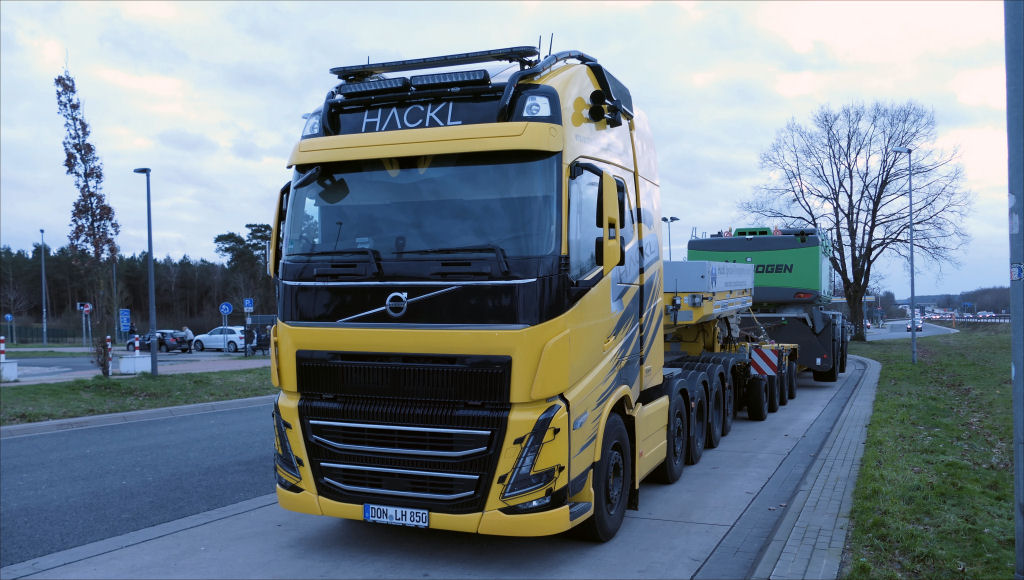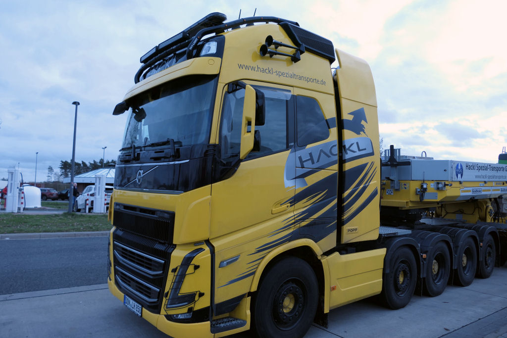 Die Schwerlastkombination bestand aus Volvo FH 05 750 10x4 mit Goldhofer THP FT 4-6 Sattelroller mit Baggerbrücke