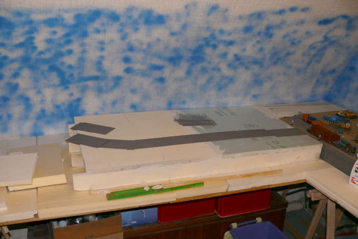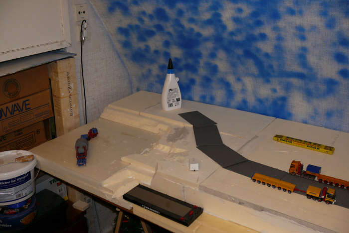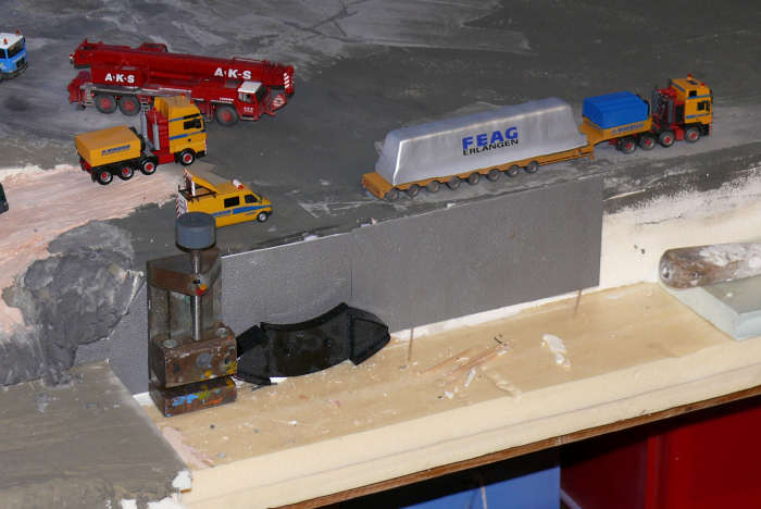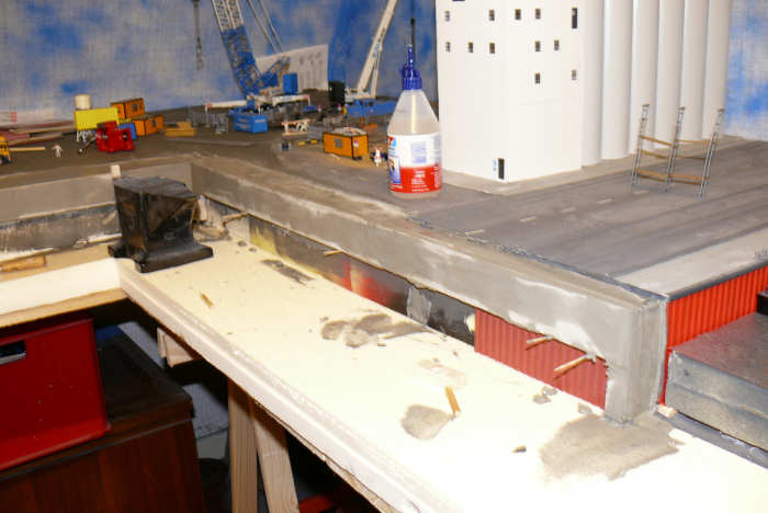 Die lange Kaimauer wird aus Bruchsteinplatten bestehen, die Fugen werden mit Halben "H" Profilen kaschiert.