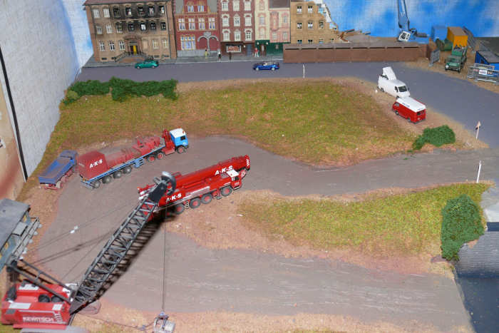 Industrie- und Gewerbegebäudemodelle zum Einsatz von Kranmodellen.