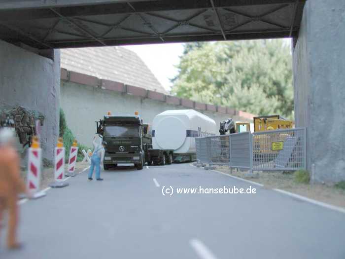 Kurz vor Sperrung der Straße schiebt sich noch ein Schwertransport mit einem Wka Generatorenhaus