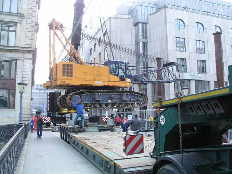 Bevor der Bagger auf die Ladefläche abgelassen werden kann muß der Tieflader noch etwas weiter an den Kran herangefahren werden