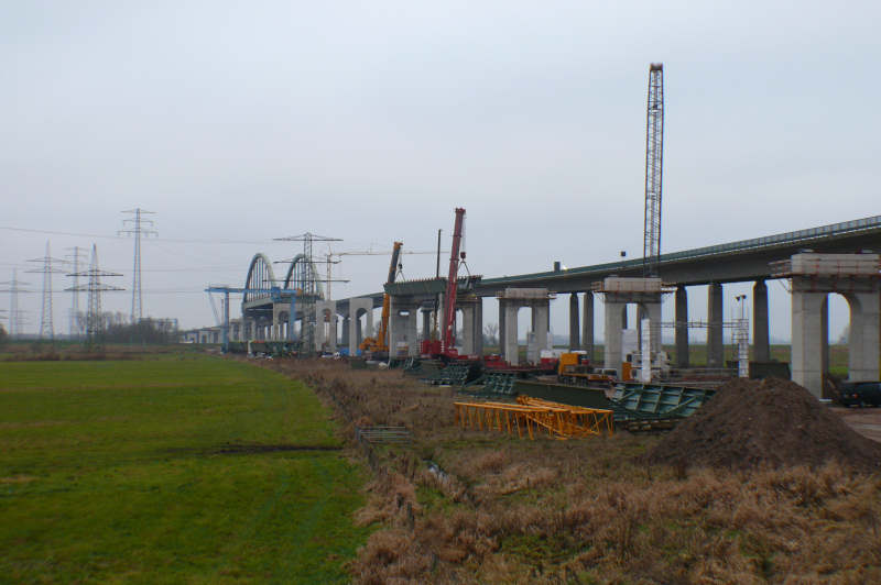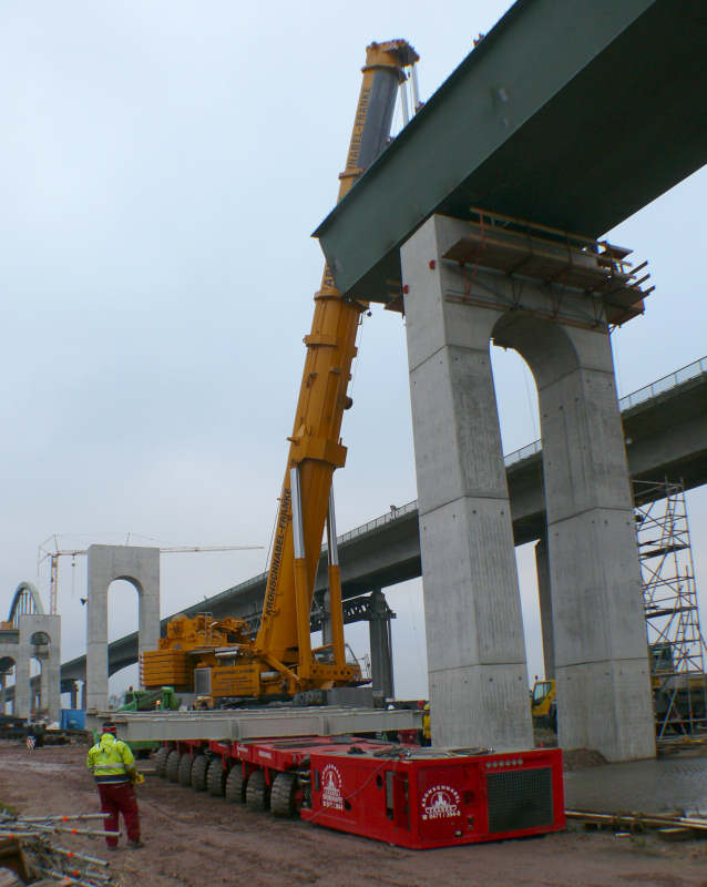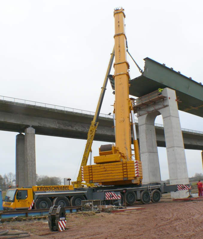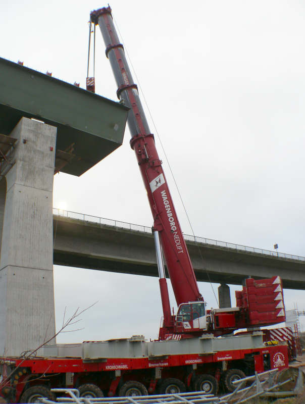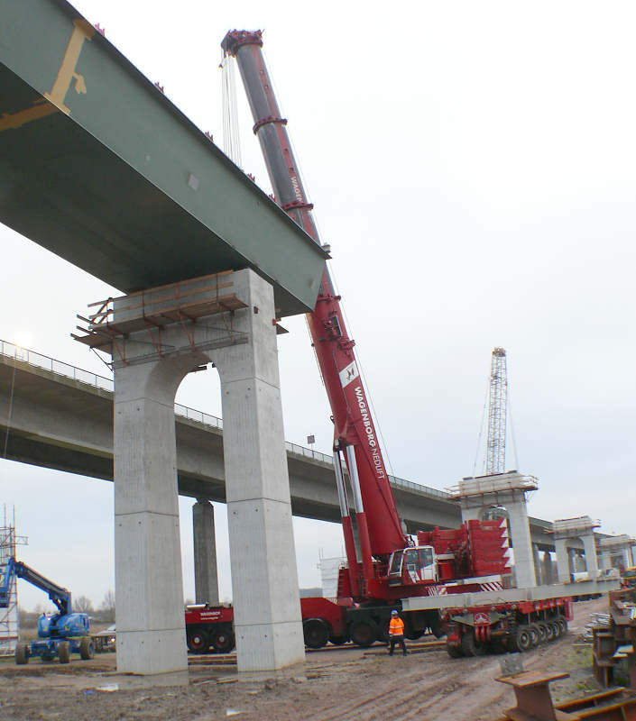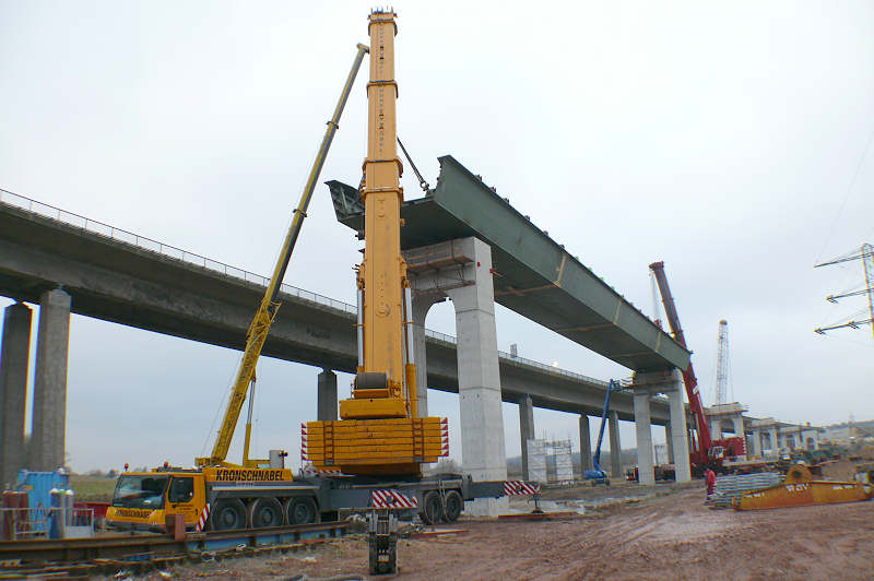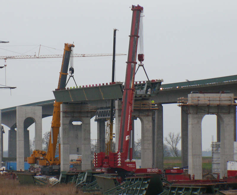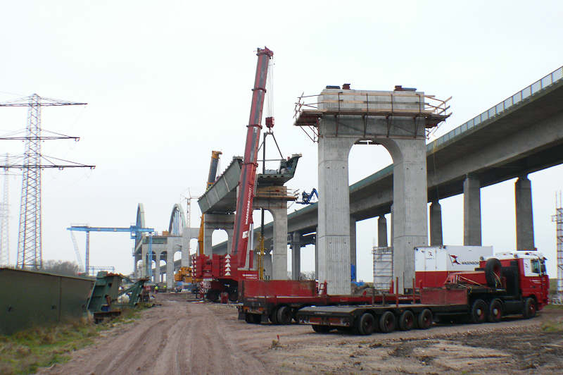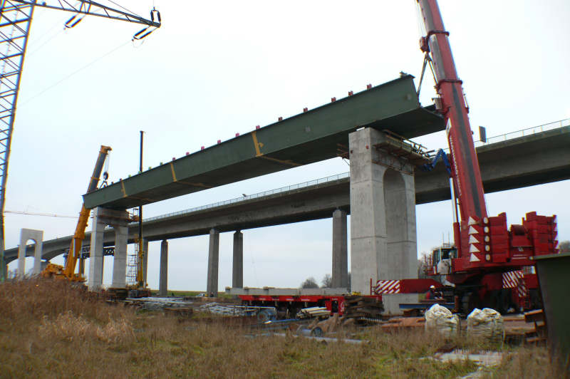 Einhub von Brückenteilen an der neuen Störbrücke in Itzehoe