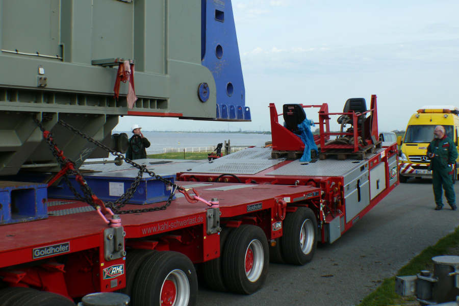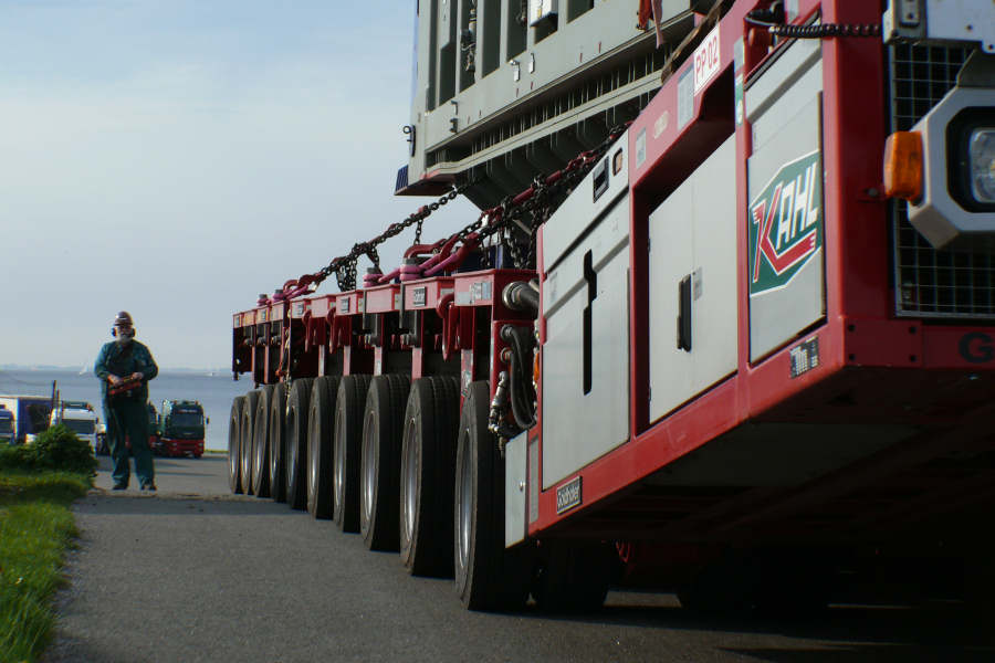 Mit dem Selbstfahrer über den Deich und Übergabe an den Schwimmkran