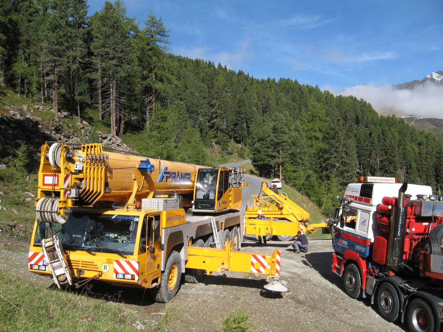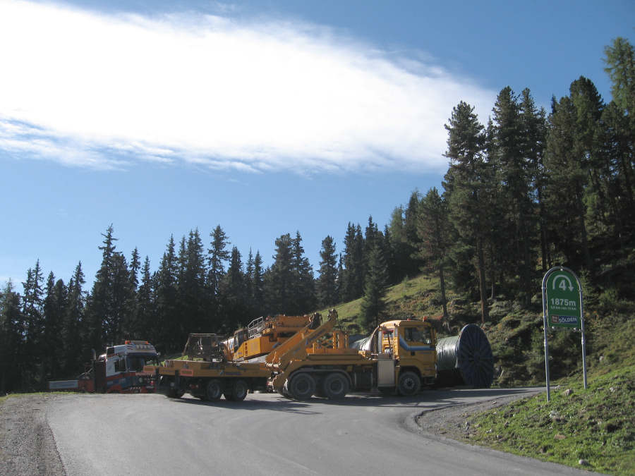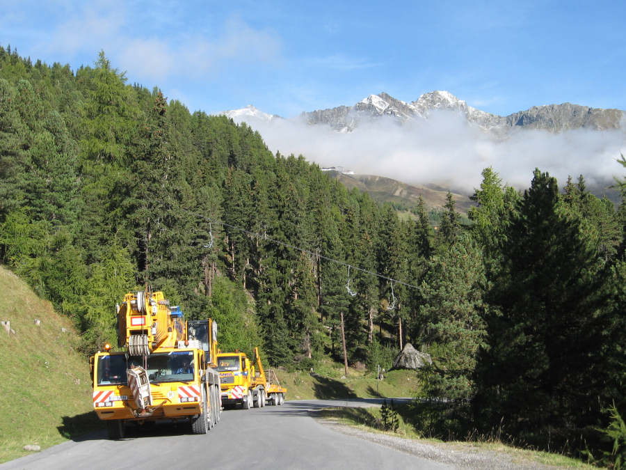 Aufgabe war es eine Seiltrommel mit einem Gewicht von 63t auf einer Seehöhe von 1875mt aufzuladen und bei der Mittelstation einer Seilbahnbaustelle
