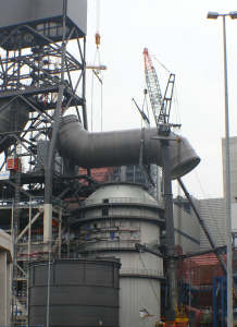 Montage der Abgaskamine der Rauchgasentschwefelungsanlage im Kraftwerk Moorburg