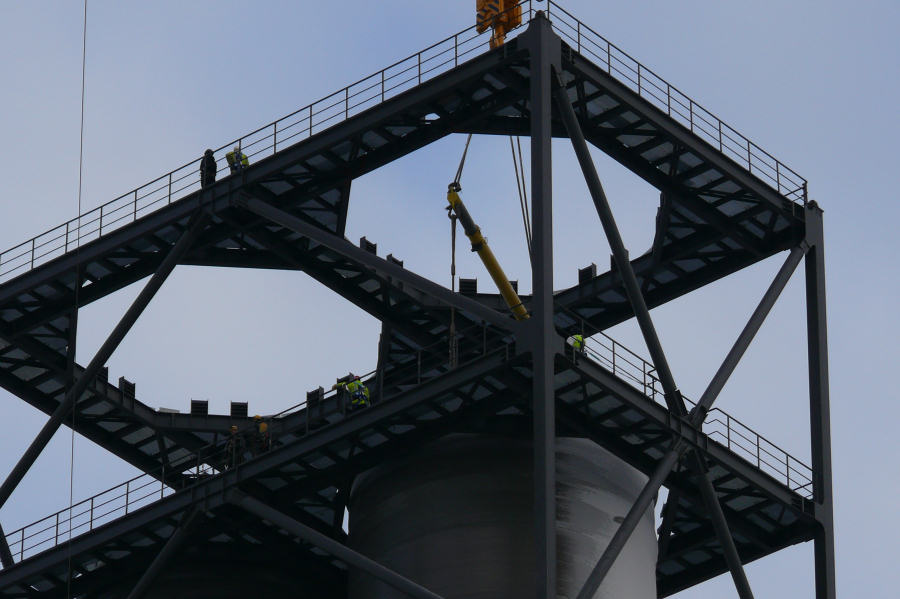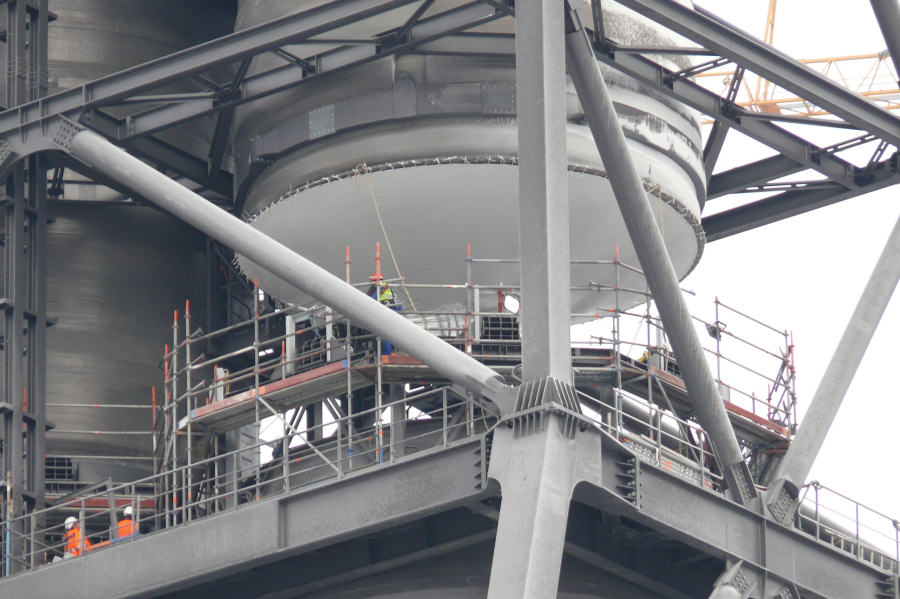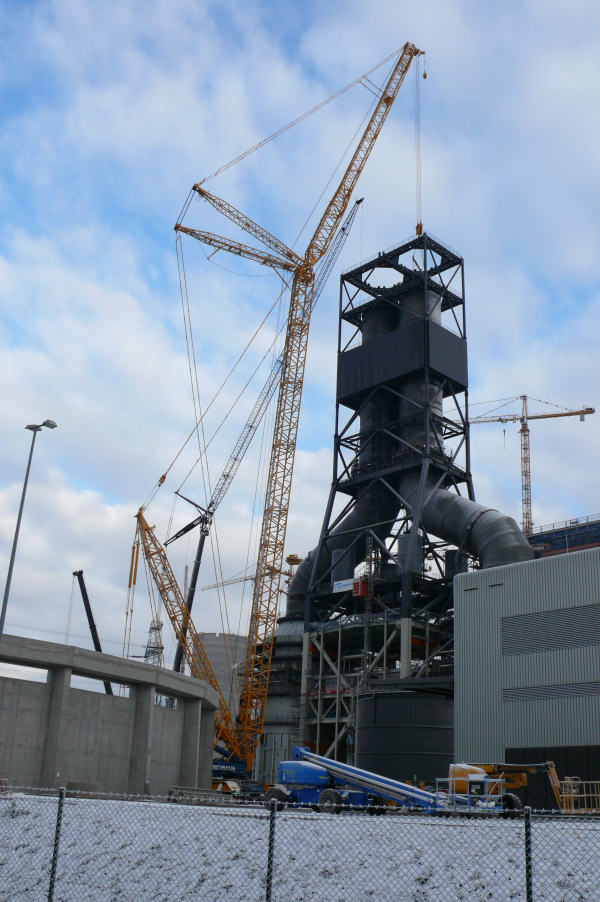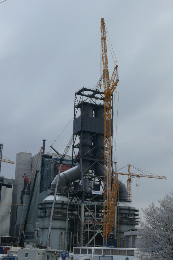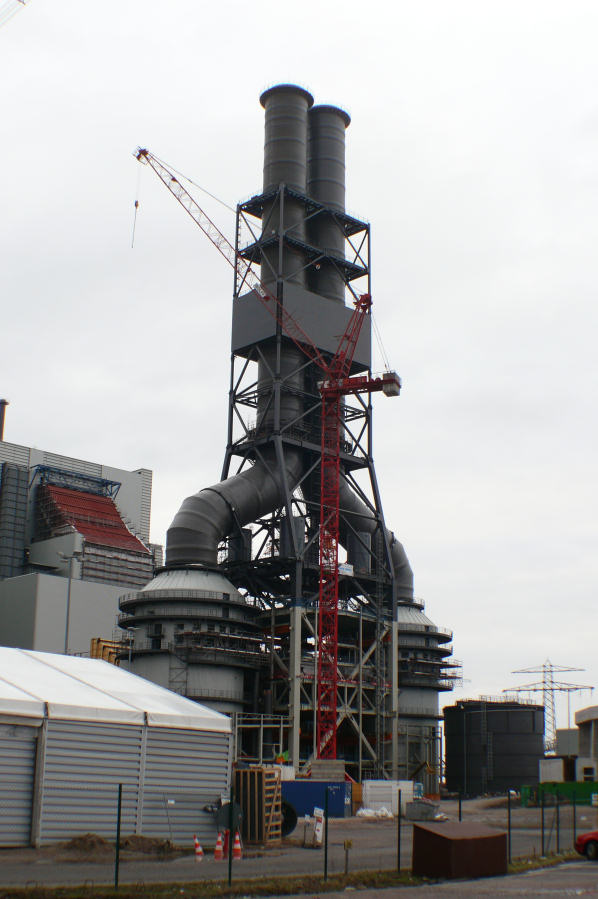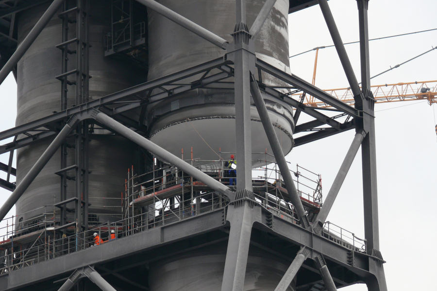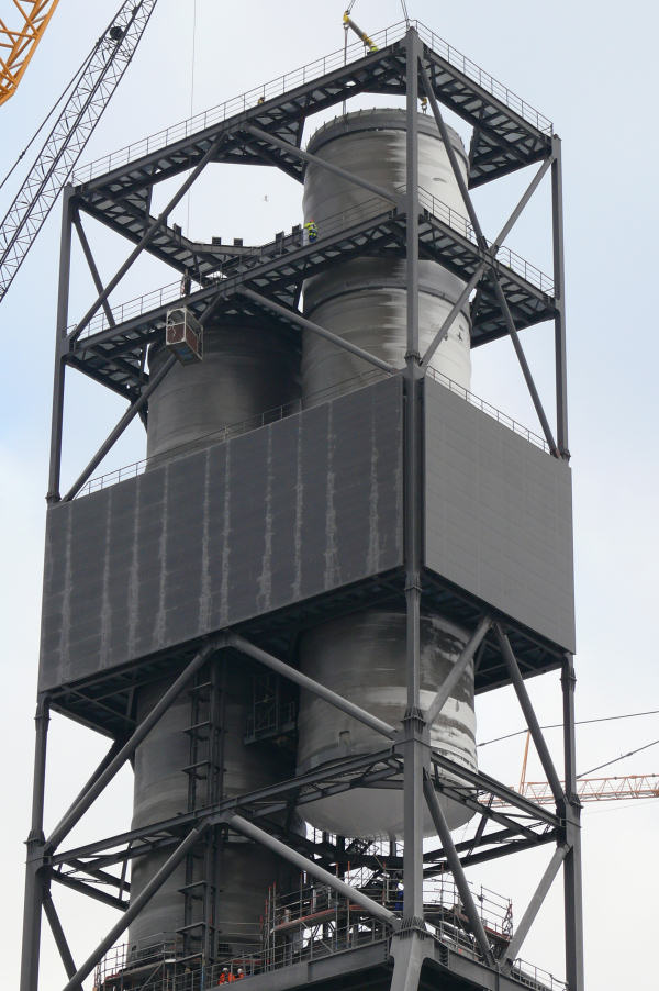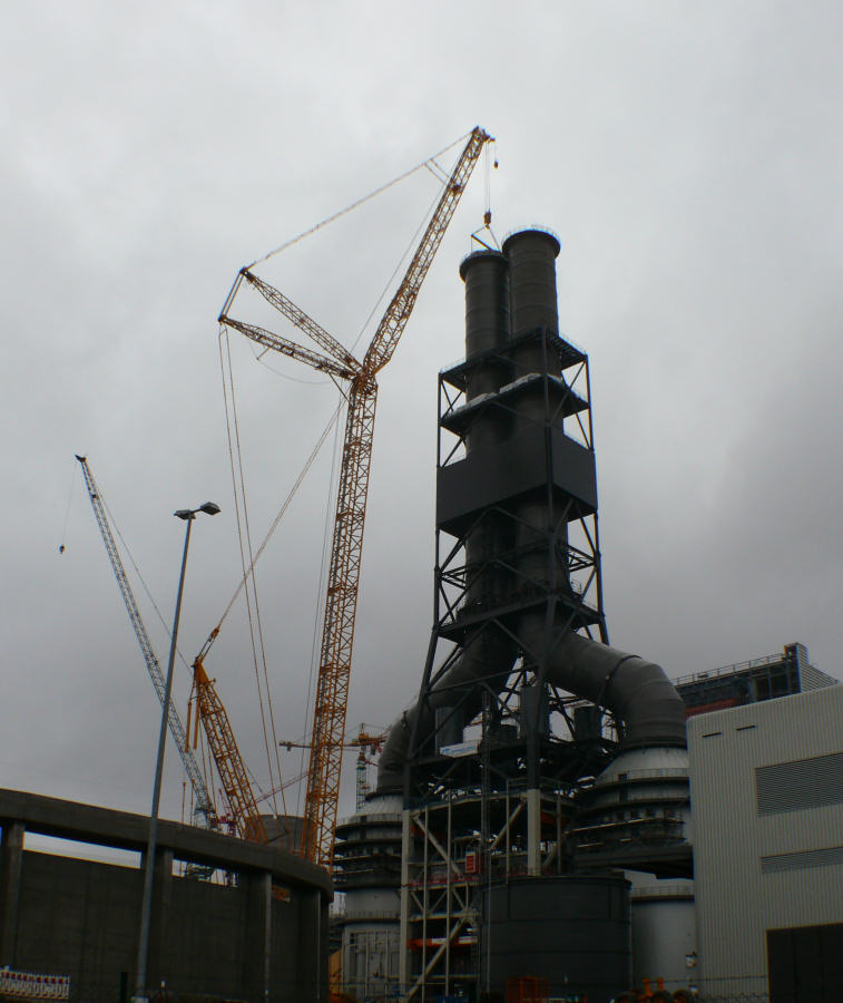 Montage der Abgaskamine der Rauchgasentschwefelungsanlage im Kraftwerk Moorburg