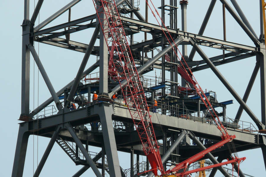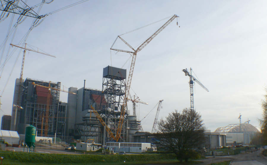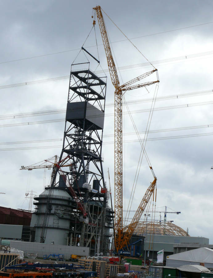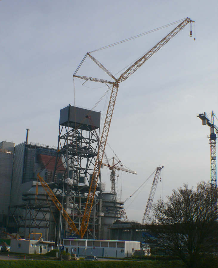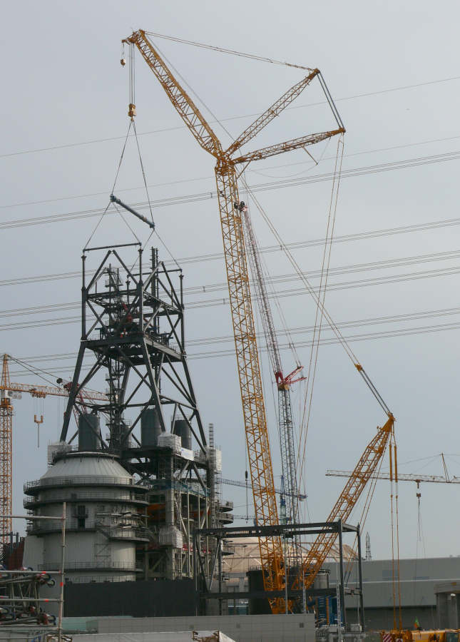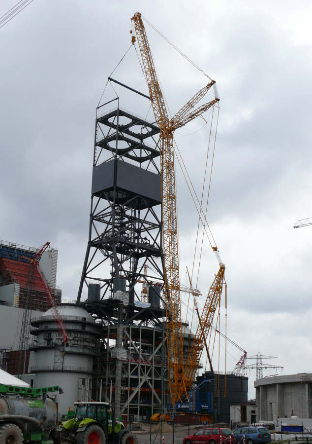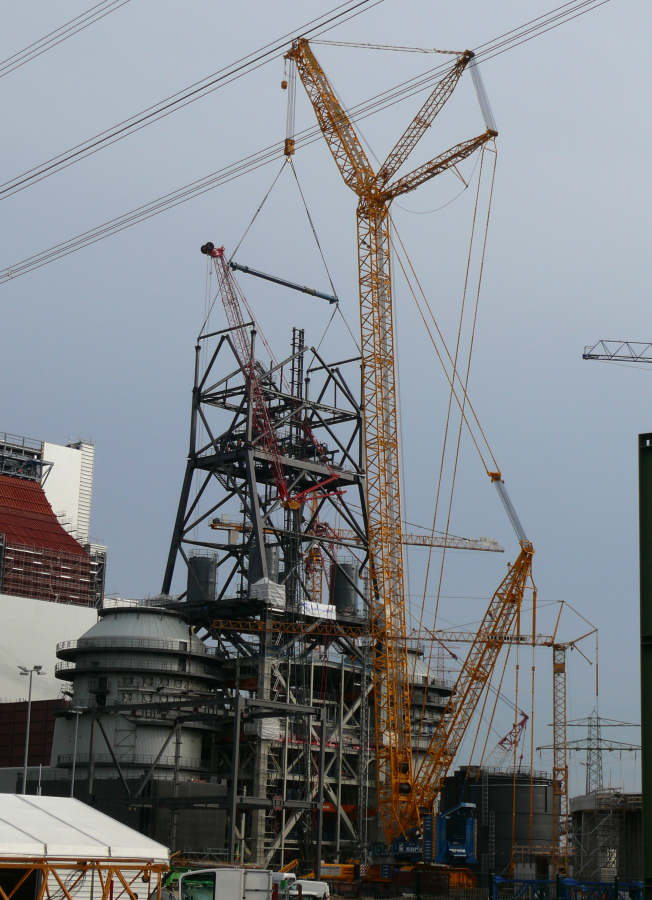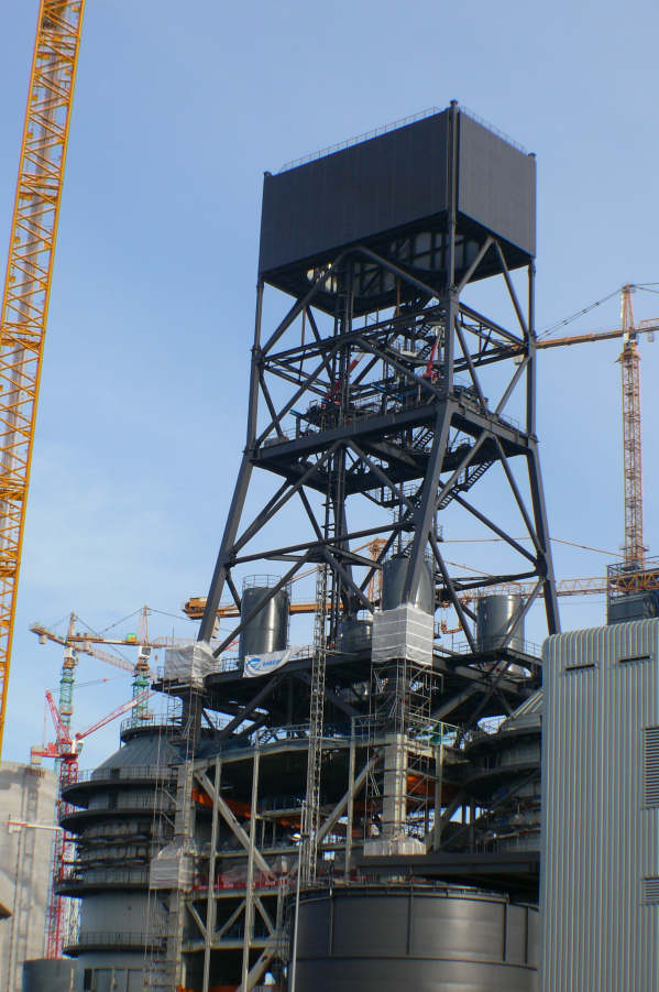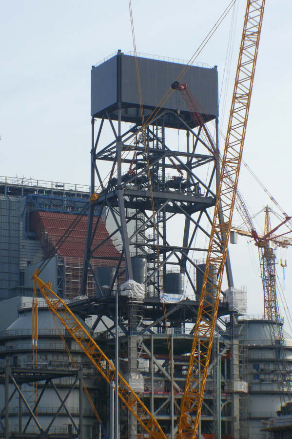 Montage der Abgaskamine der Rauchgasentschwefelungsanlage im Kraftwerk Moorburg