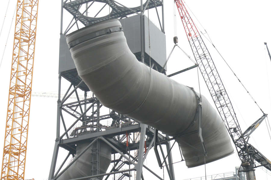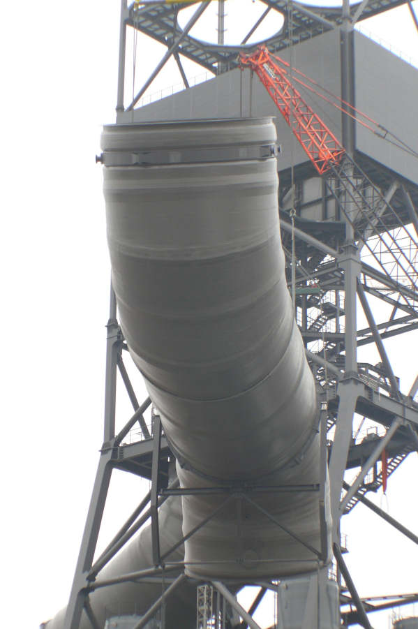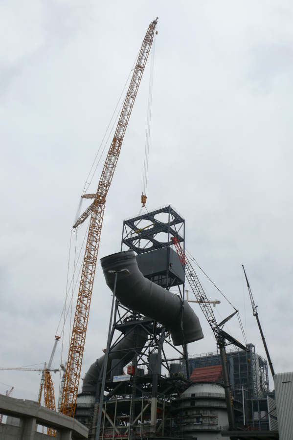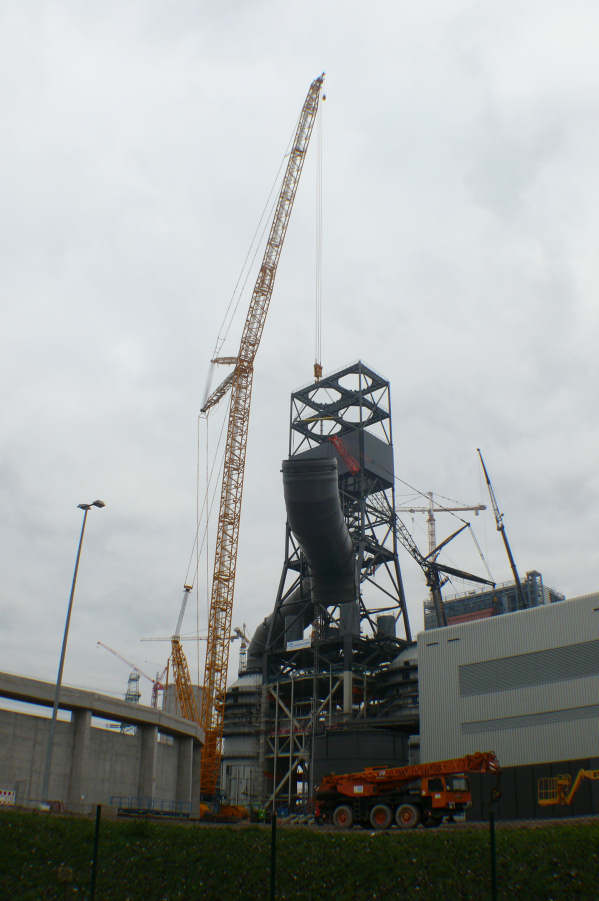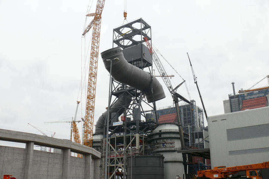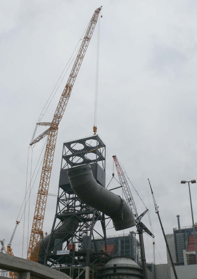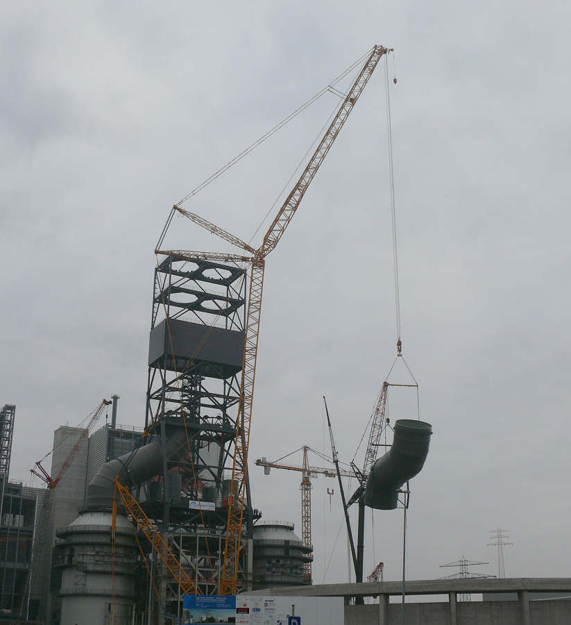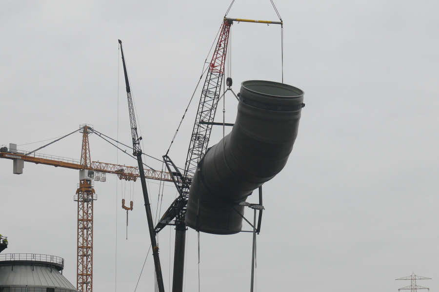 Montage der Abgaskamine der Rauchgasentschwefelungsanlage im Kraftwerk Moorburg