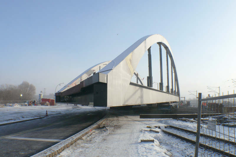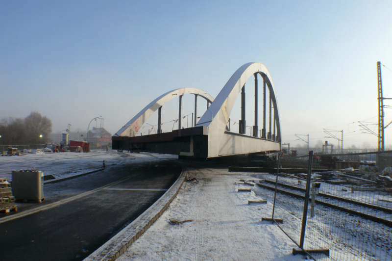 Der rund 500 t schwere Brückenneubau aus Stahl, welcher zwei Fahrspuren der Straße Veddeler Damm aufnehmen sollte