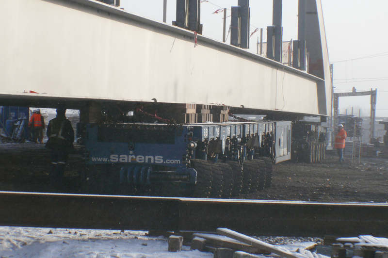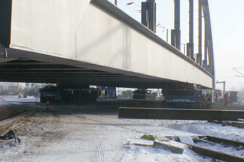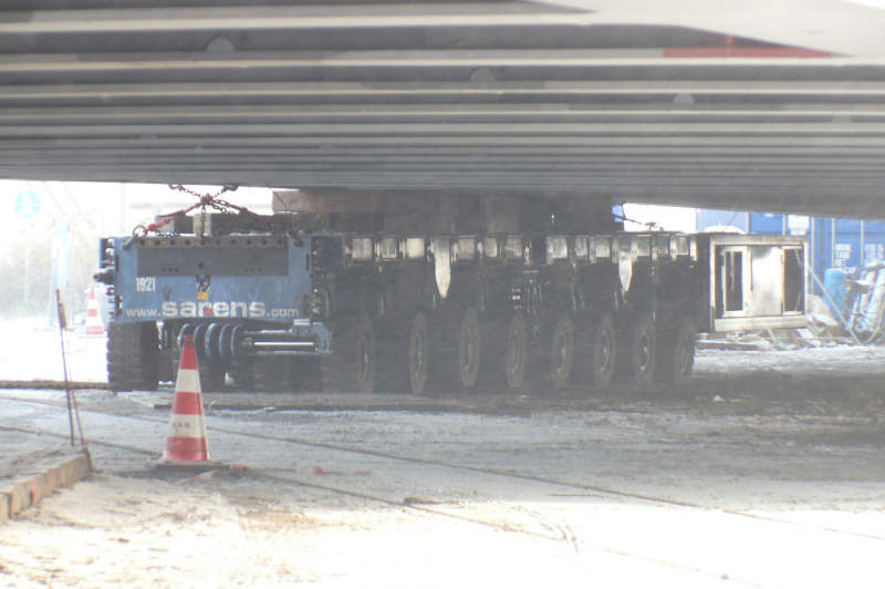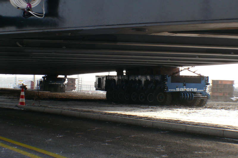 vier Brückenneubauten per Selbstfahrer zum Einbauort gefahren.