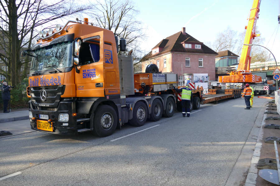 Derweil wird der Tieflader schonmal in Stellung gebracht, und für die Aufnahme der Brücke vorbereitet.