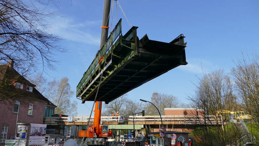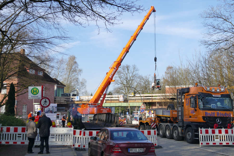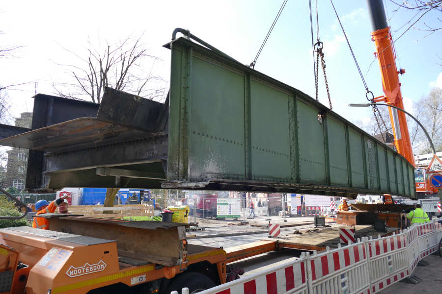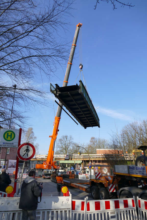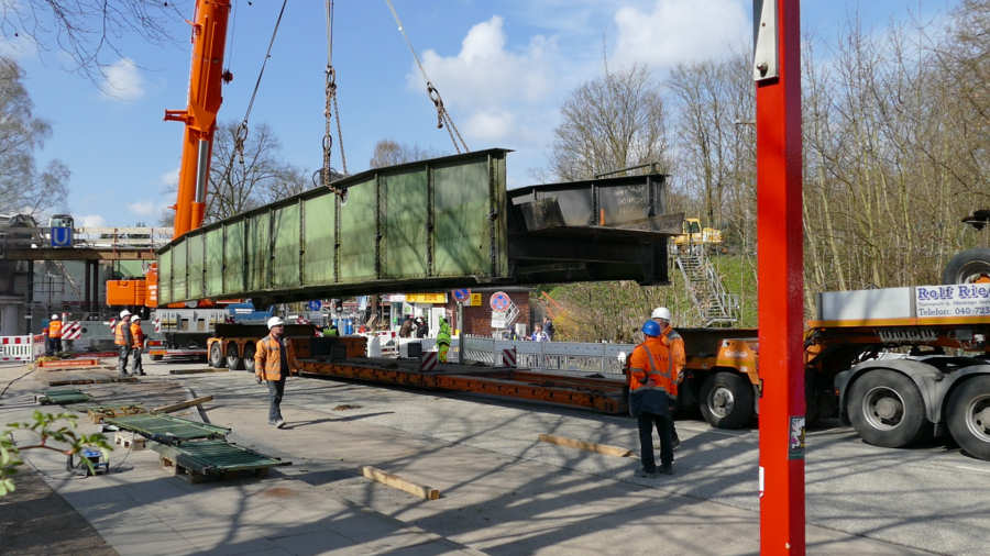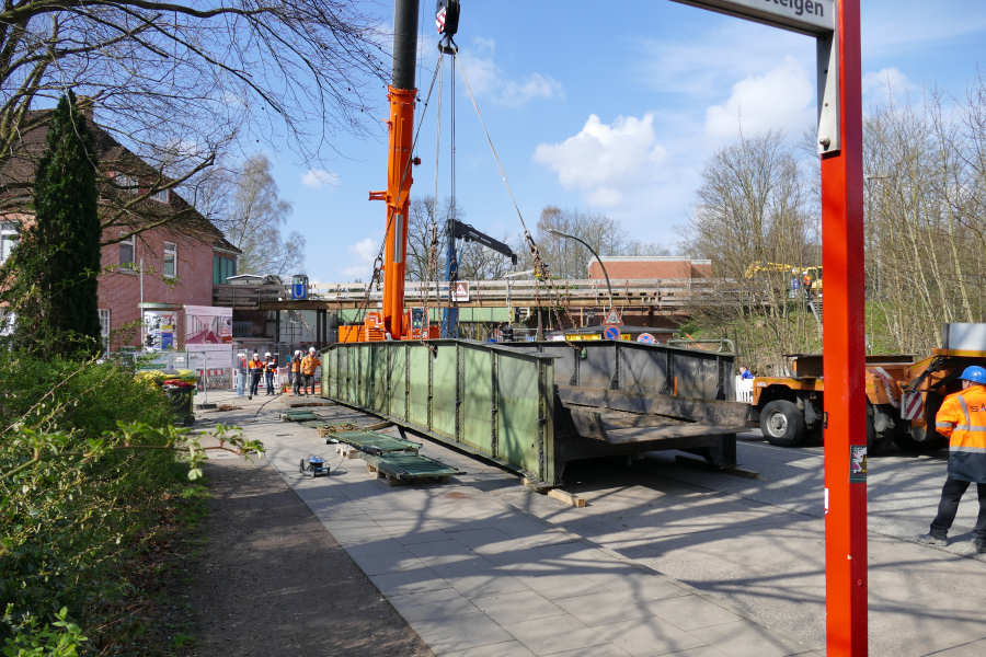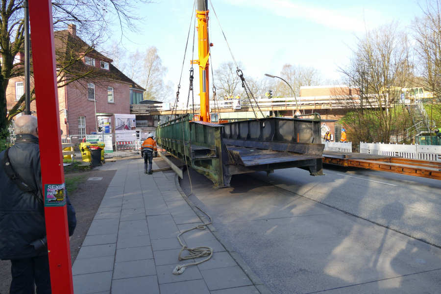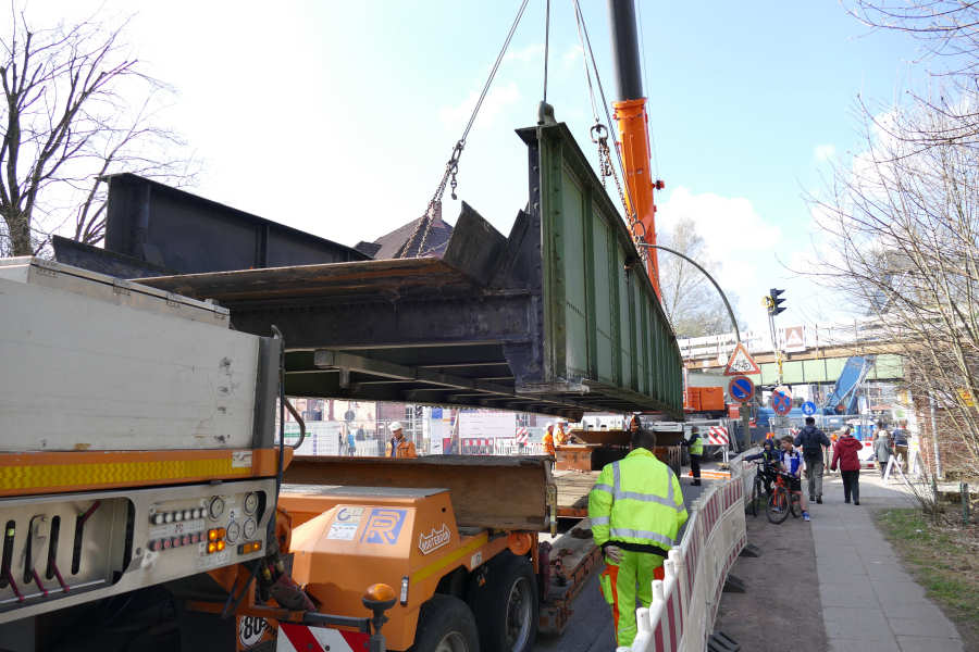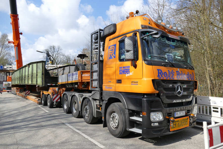 Die Brücke wird zunächst neben dem Tieflader abgelegt, um den Laufsteg abzubrennen