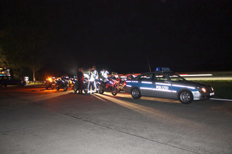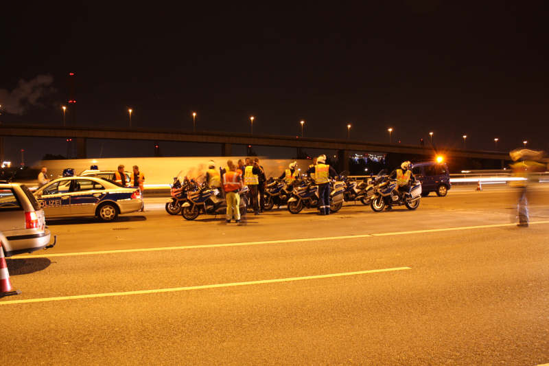 Trotz der späten Stunde, es ist ca 23.30 Uhr, hat sich auf der gesperrten Seite ein langer Stau gebildet.