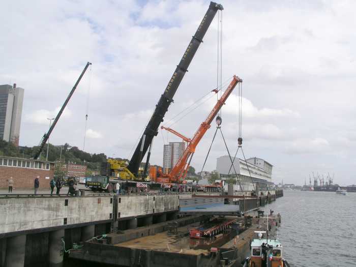 Umladung einer 150 t schweren Hochbahnbrücke am Hamburger Fischmarkt