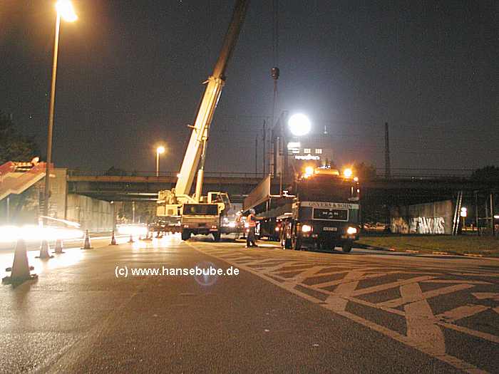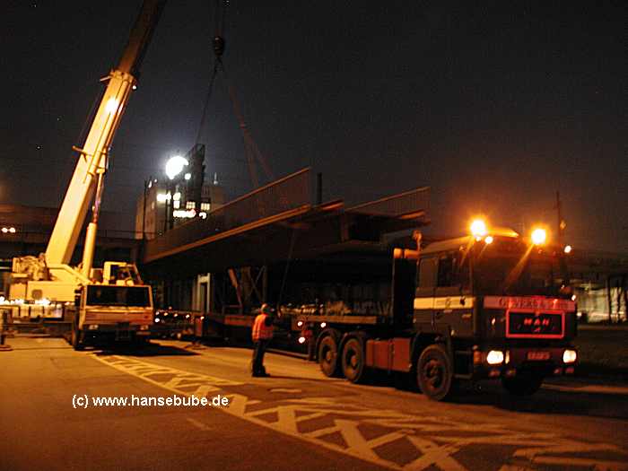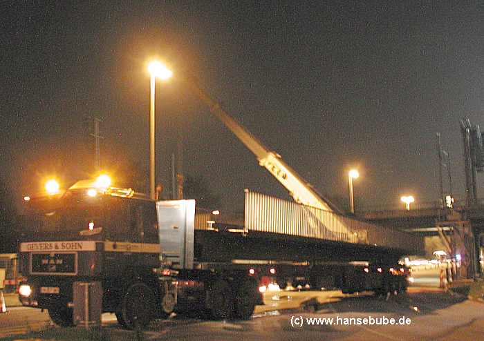 Der erste von vier Brückenteiltransporten wartet auf die Abfahrt.