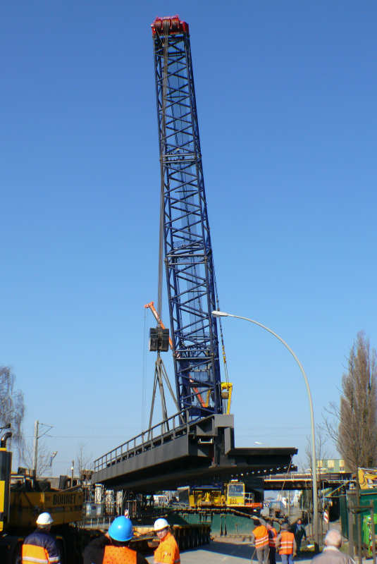 Die Brückenteile wurden auf ein Hilfsgerüst neben die alte Brücke gehoben, wo die Teile miteinander