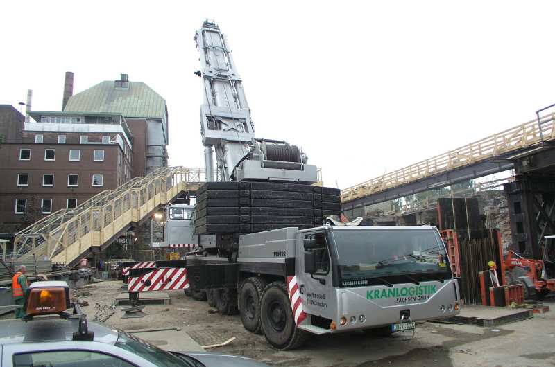 Um eine Brücke im hinteren Bereich der Baustelle einheben zu können, wurde der Kran mit montiertem Ballast um