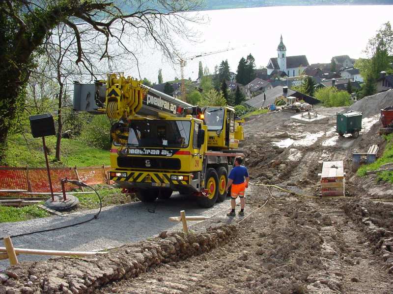 Einen 50 to Grove GMK 3050 ( 6 x 6 Allrad ) musste über eine Steilrampe ca. 200 m den Berg runter
