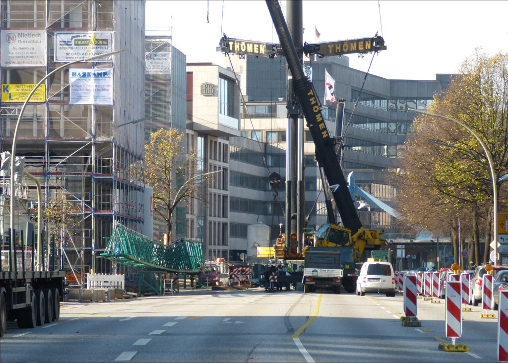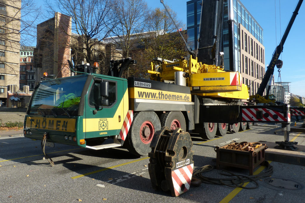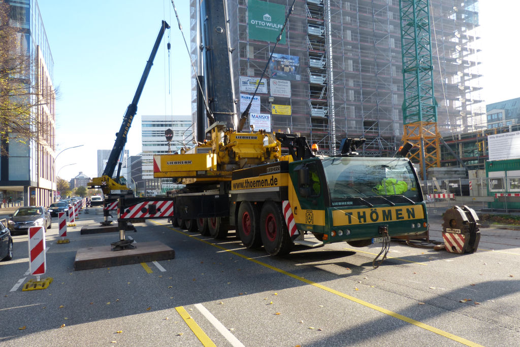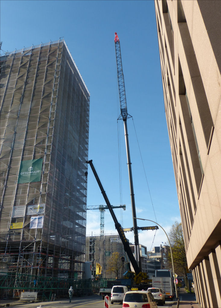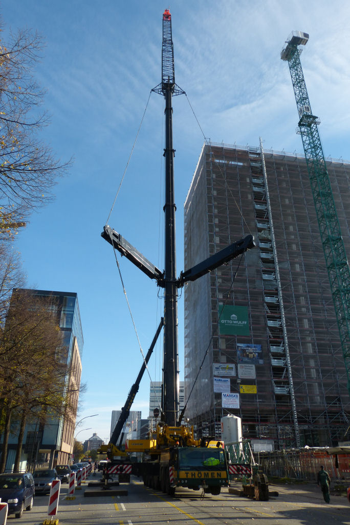 35 m Festanbau Spitze und TY für eine TDK Montage an der Willy Brandt Straße, geenüber der Nikolaikirche. November 2014.