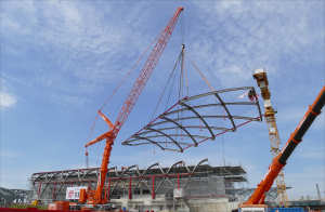 Die bis 91 m lange Gitterspitze erweitert den Einsatzbereich des 500-Tonners bis 145 m Hubhöhe