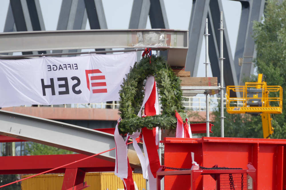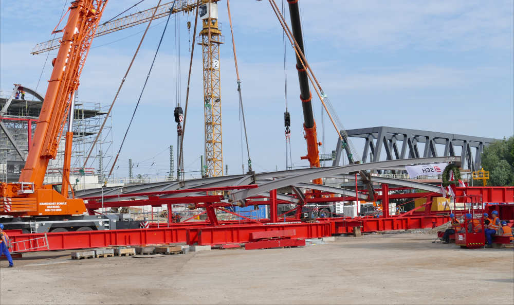 Anfang Juni 2019 wurde das letzte Stahl Dachkonstruktionsteil des S Bahnhofes Elbbrücken in der Hafencity Hamburg montiert.