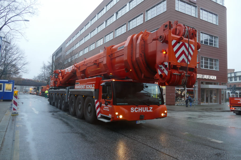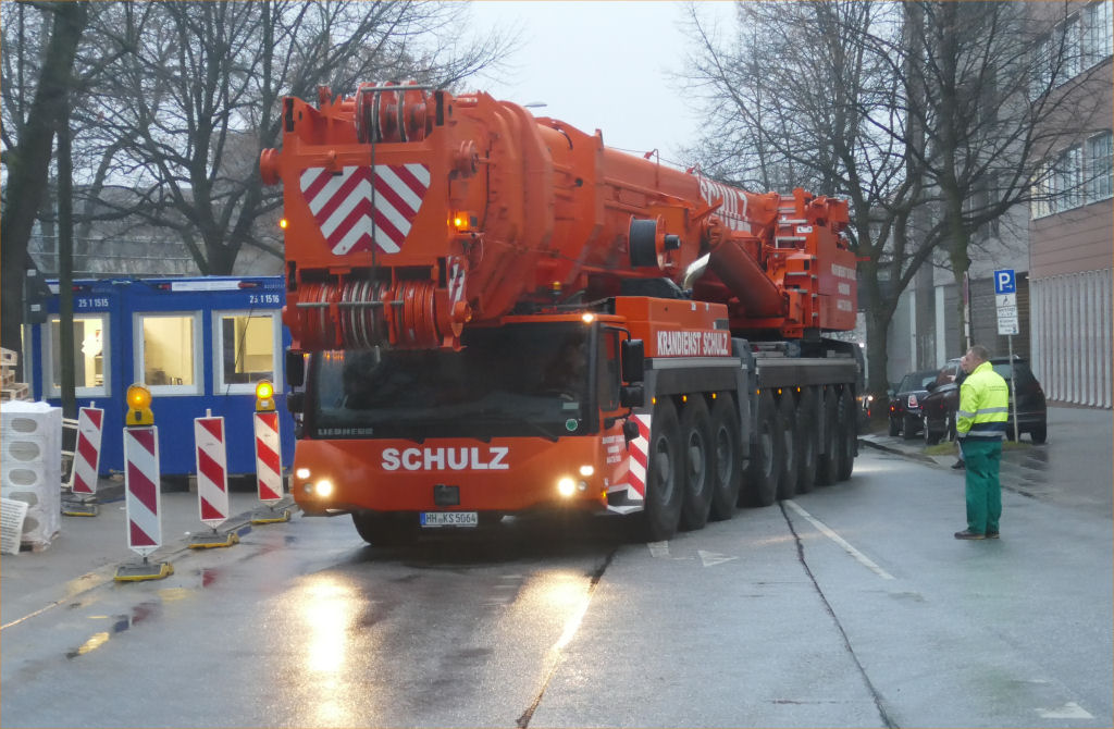 Die Bilder zeigen die Aktion von der Abfahrt des Kranes am Platz, über den Hub bis zur Abfahrt von der Baustelle.