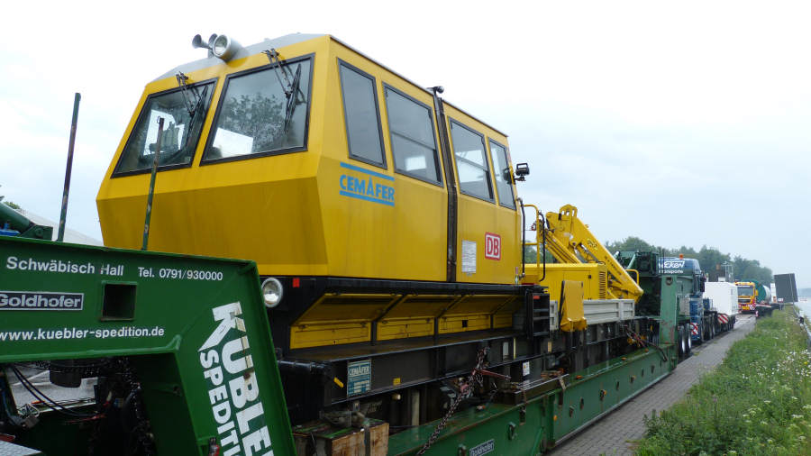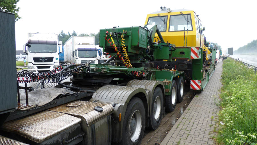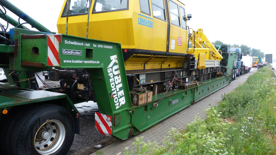 Transportiert wurde ein Bahndienstfahrzeug in einer Kesselbrückenkombination.