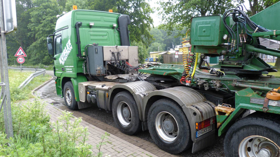 Die Zugmaschine war eine MB 3358 mit zweiachs Scheuerle Jeepdolly auf den