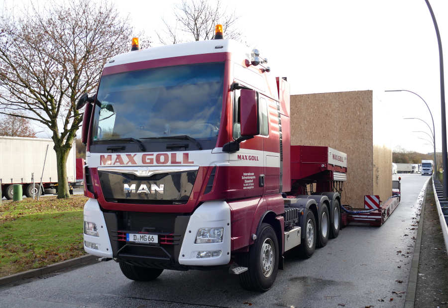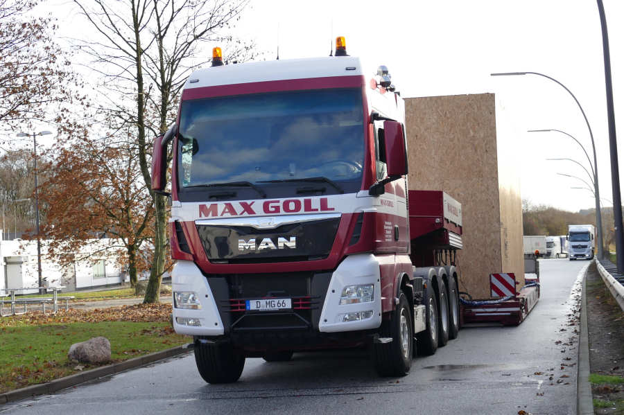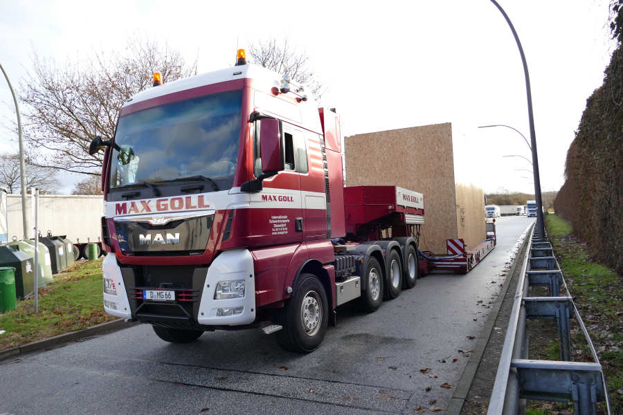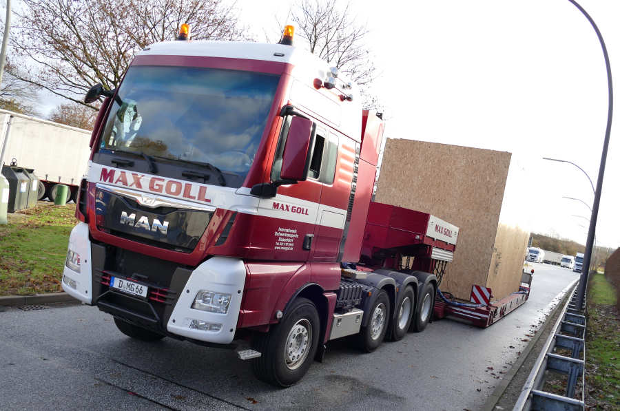 Die Transportkombination bestand aus MAN 41.540 TGX 8x4 Euro 6 Zugmaschine und Goldhofer THP ET dreiachs