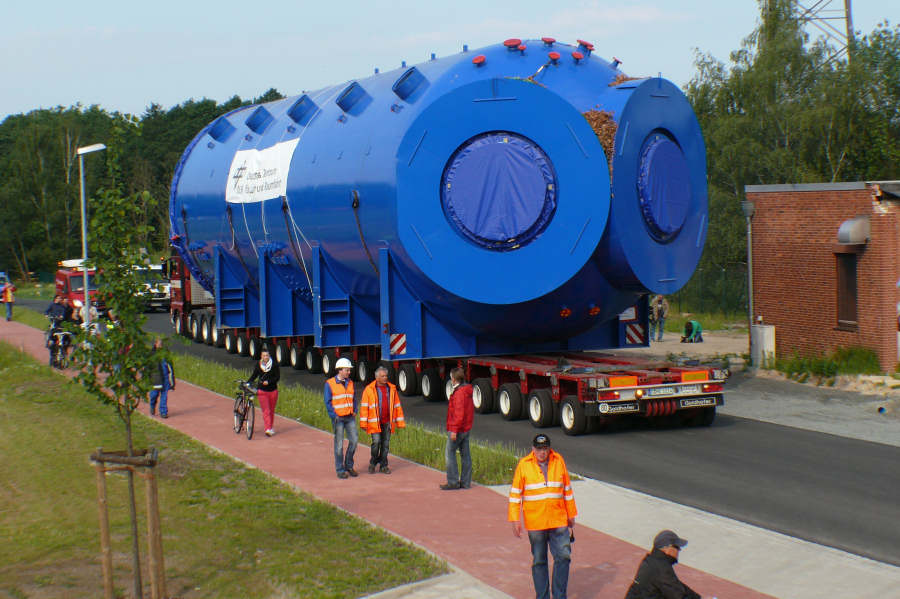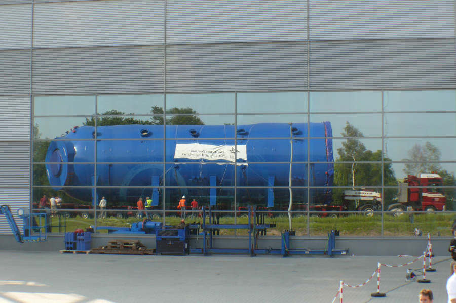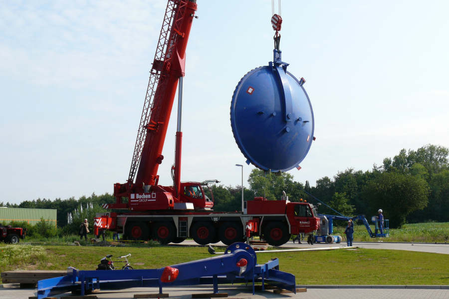 Das Ziel ist erreicht, bevor der Autoklav abgestellt werden kann, wird noch die Tür montiert, hierzu war ein 160 t Telekran vor Ort.