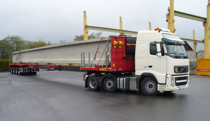 Betonbindertransport, Gesamtlänge von 38,50m und einem Gesamtgewicht von 66 t
