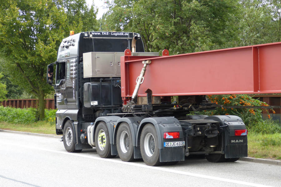 MAN 41.540 TGX mit 48 m Rohrbrücke auf Nachläufer Transport